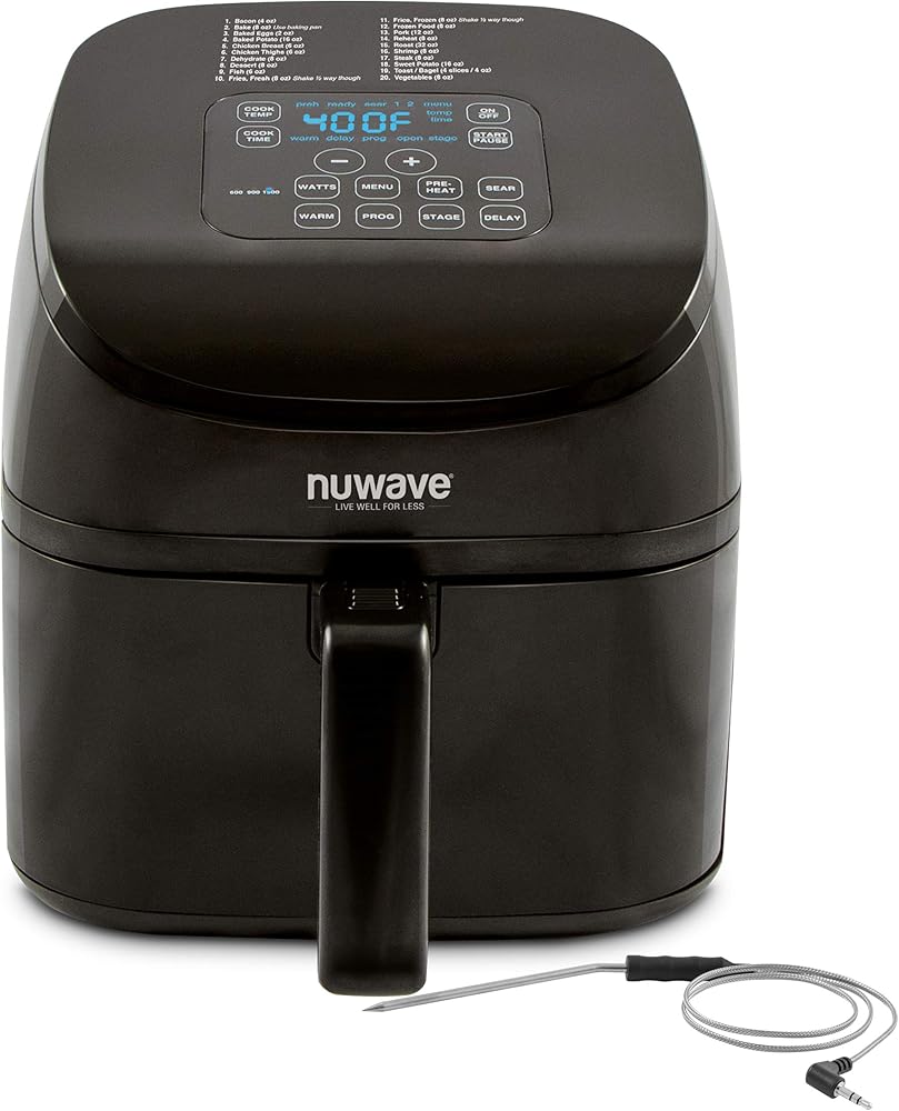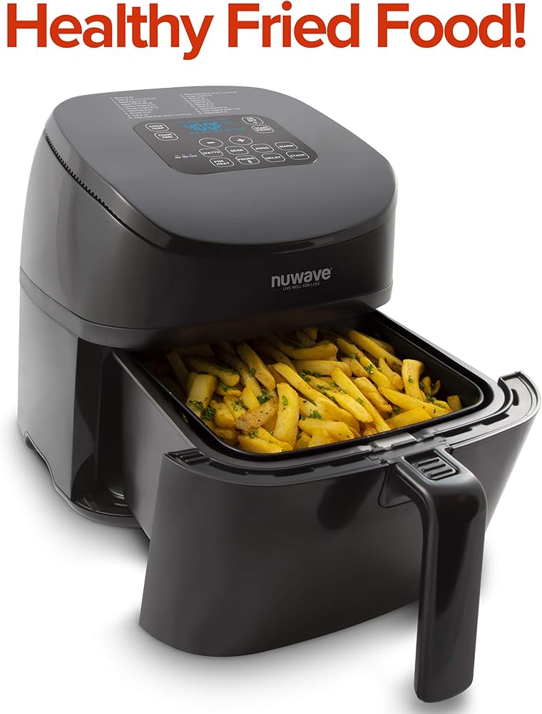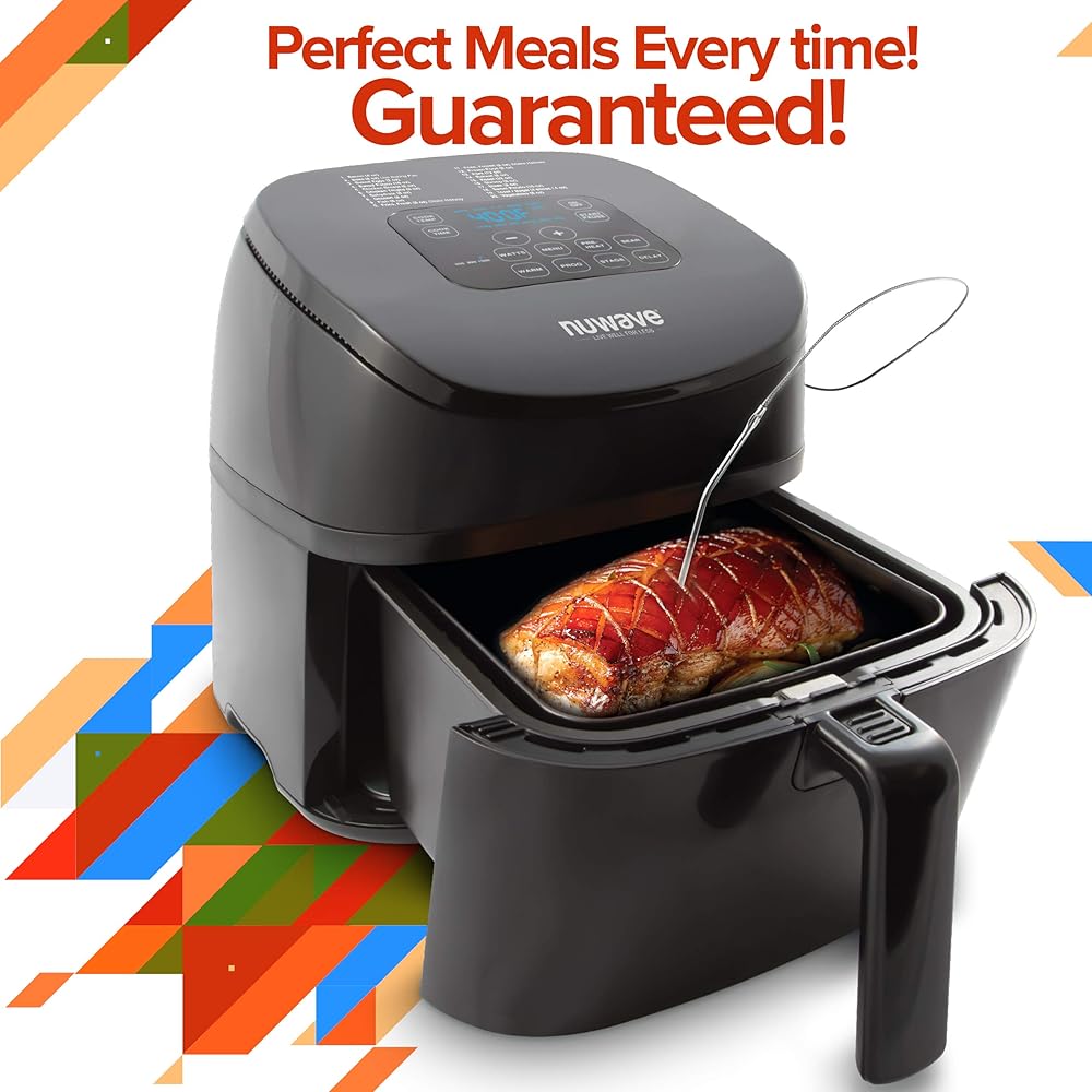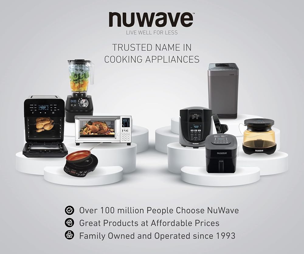 تتضمن مقلاة الهواء الرقمية NUWAVE BRIO سعة 4.5 لتر تحكمًا دقيقًا في درجة الحرارة، وأدوات تحكم رقمية بلمسة واحدة، و6 إعدادات مسبقة سهلة، والتحكم في القوة الكهربائية، وكتاب الوصفات، وتطبيق Nuwave Cooking Club