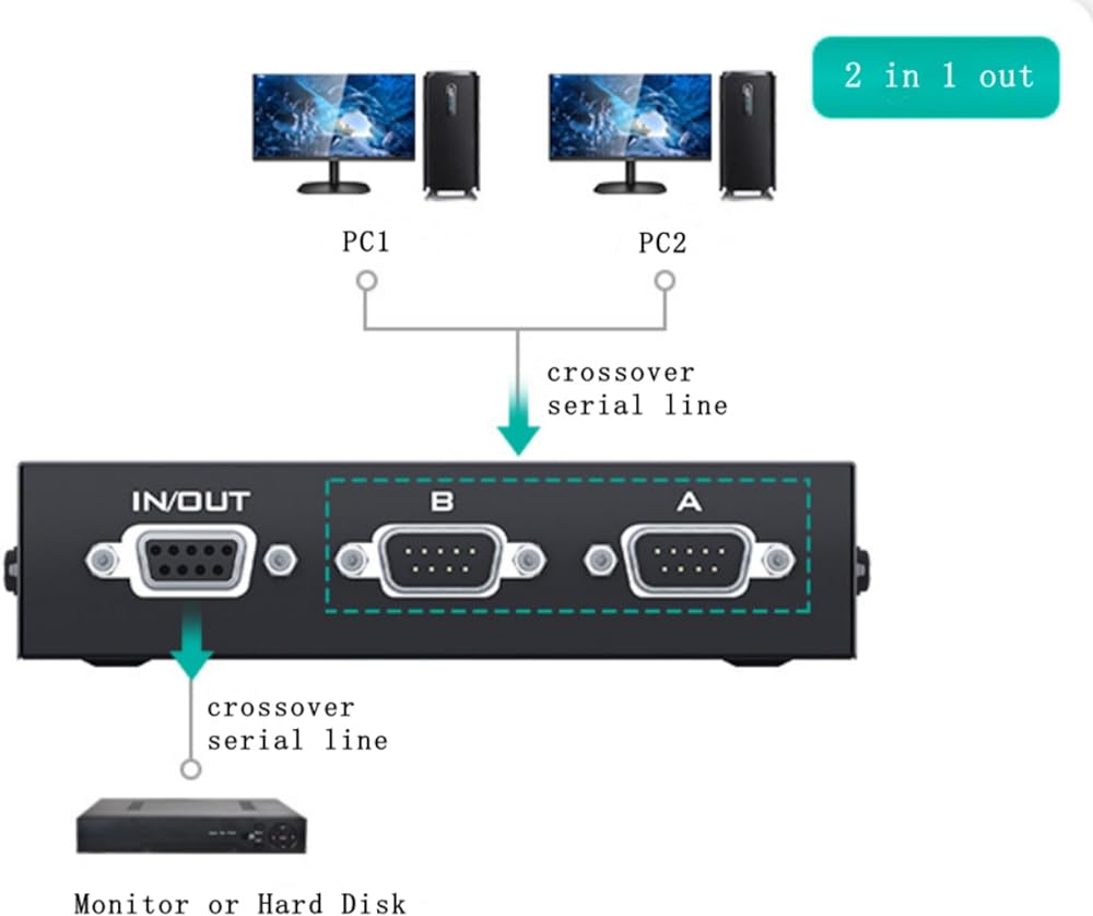 RS232 Serial Switcher Shared 2 in 1 out is a powerful, high performance device for home entertainment systems, conference rooms, showrooms, industrial controls, etc. It allows you to easily externalize 2 computer hosts to a monitor or serial hard drive (1 host at a time).