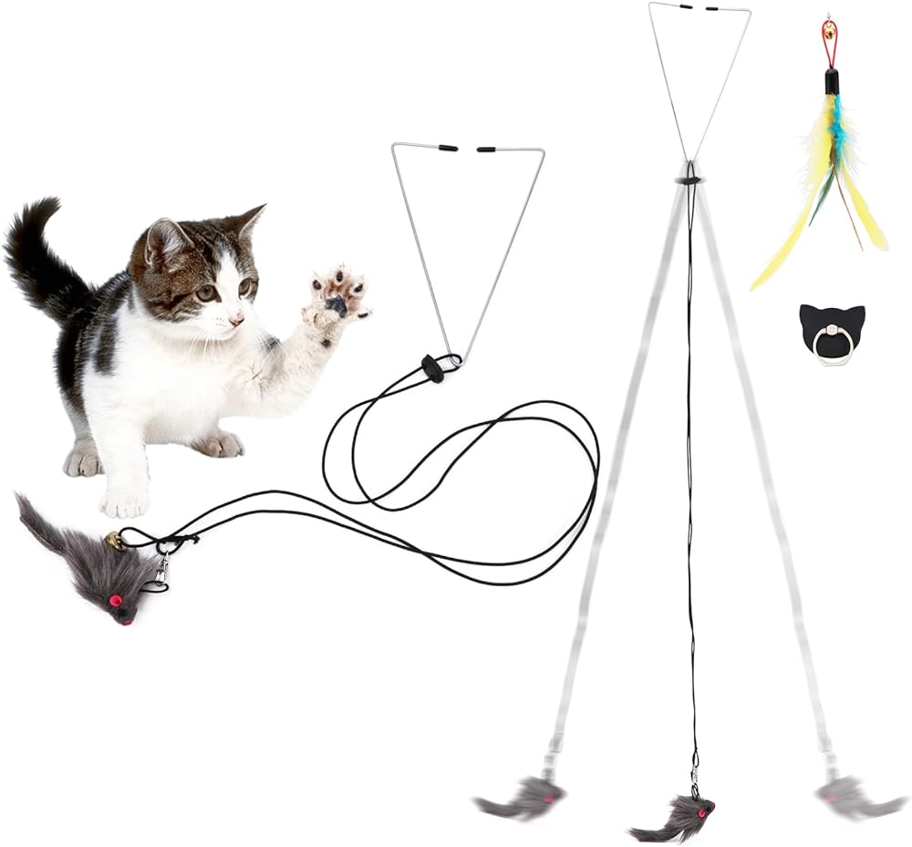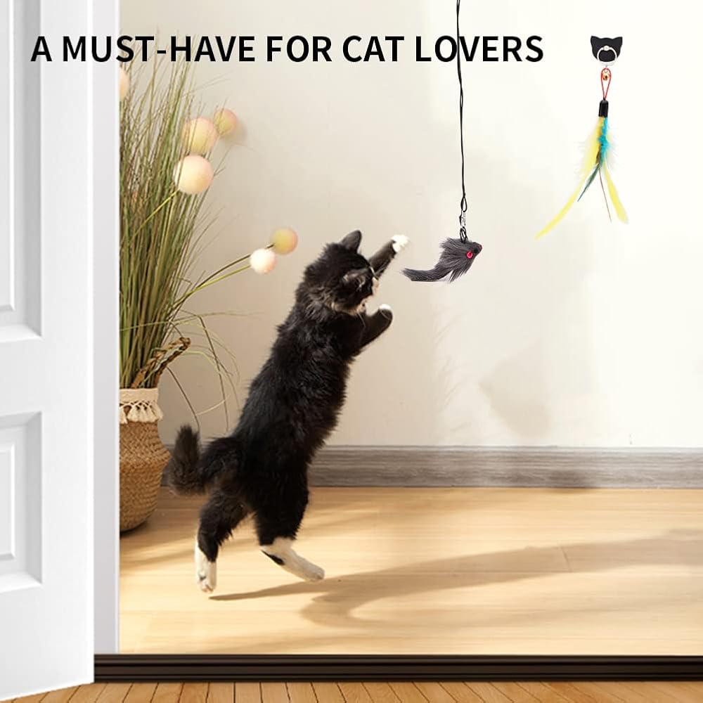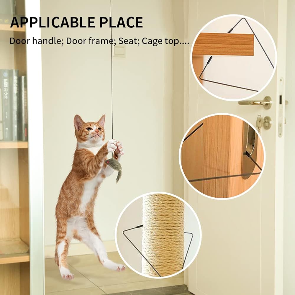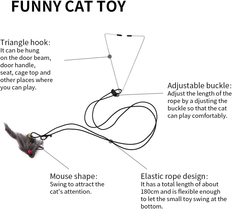 • The feathered cat toy can be hung on a door frame or knob. As soon as your cat touches the toy, the plush mouse will wiggle and the bell on the cat toy will make a crisp sound, encouraging your cat to paw at the toy and play with it.
