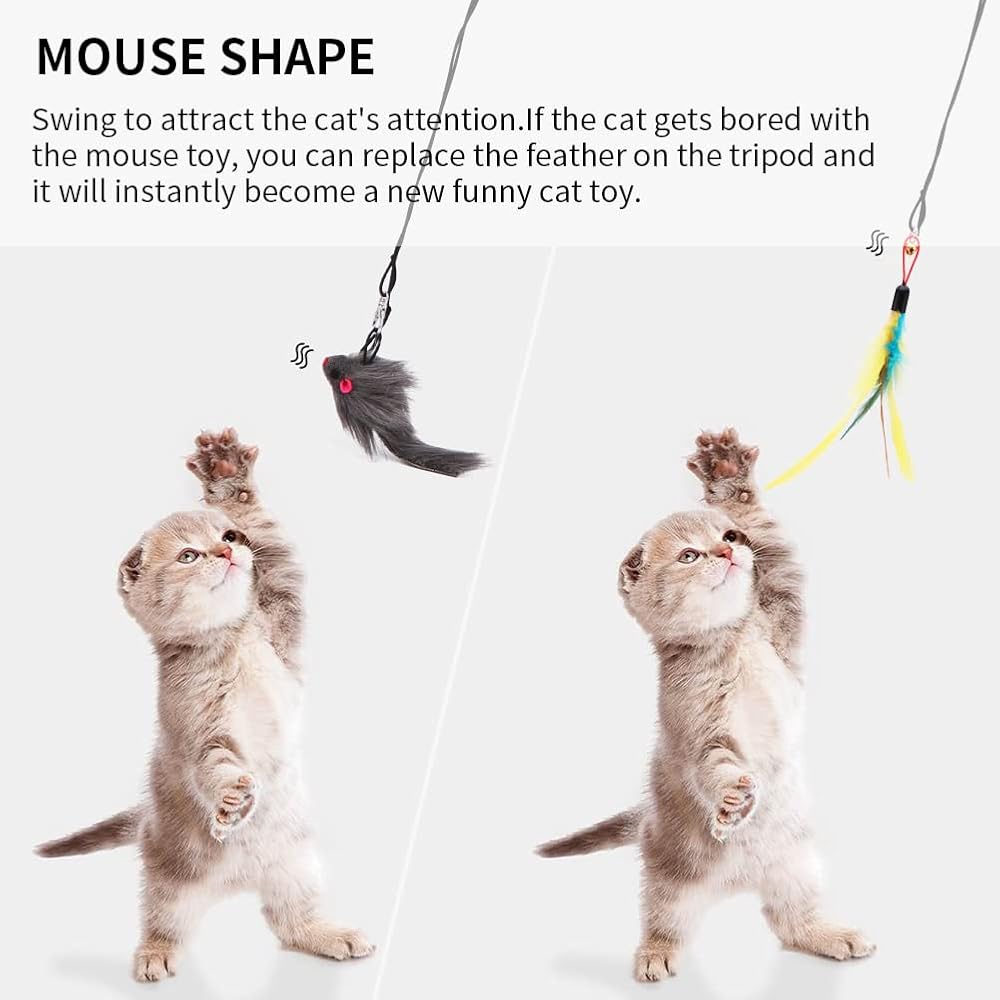 • The interactive cat toys include faux feathers, and you can change the head of the teaser for added fun, so your cat will never be bored again. Suitable for kittens and cats of all ages and sizes!