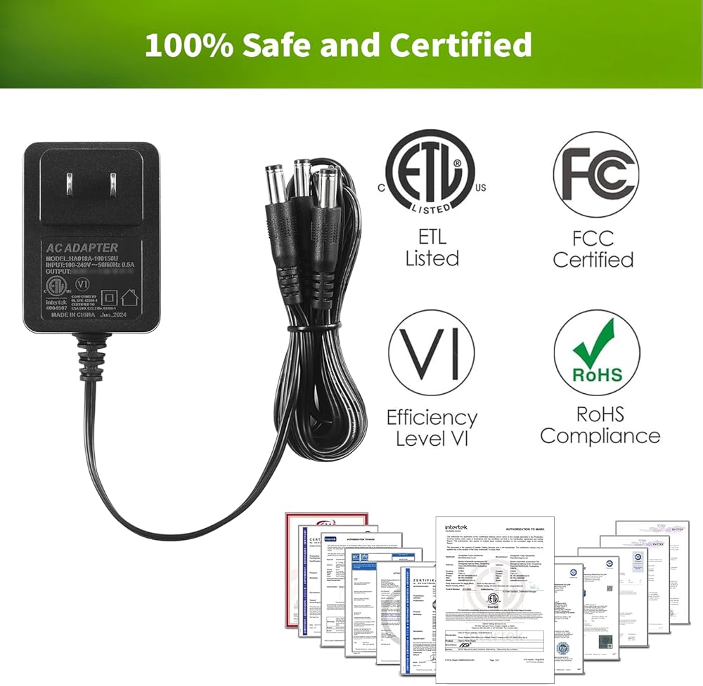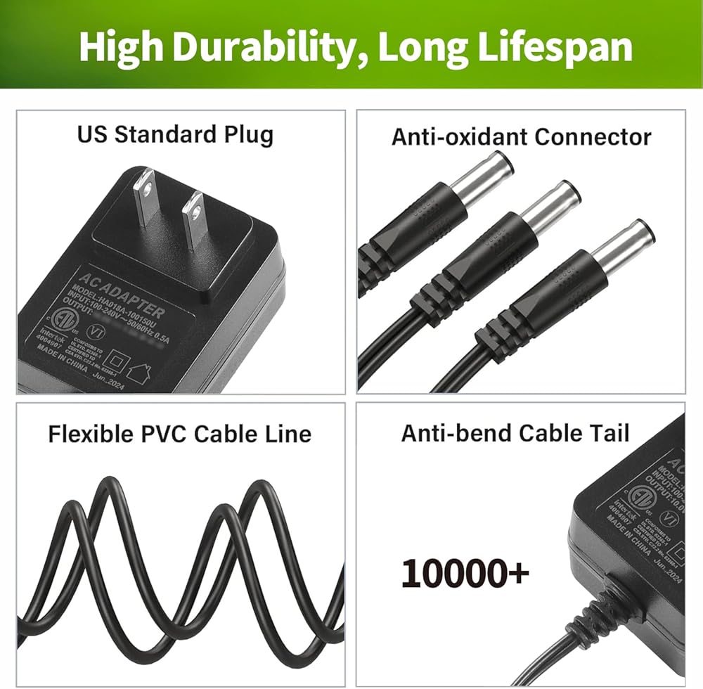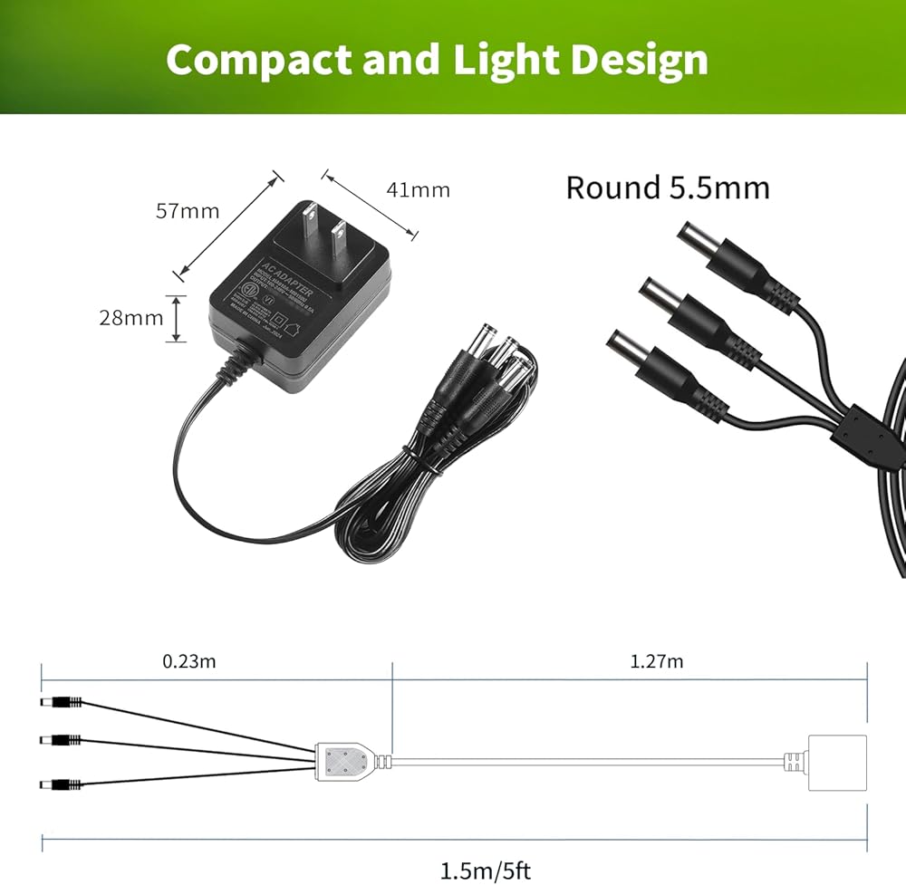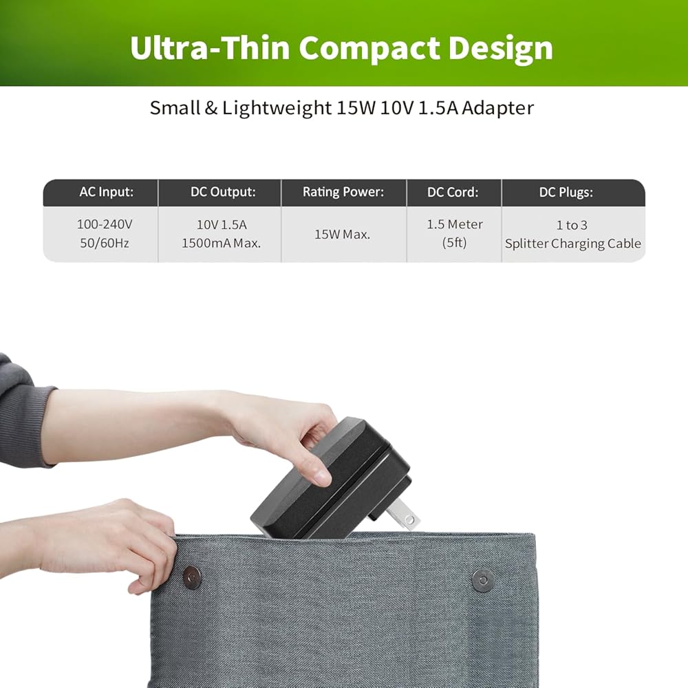 المواصفات: مقابس التيار المستمر: 1 إلى 3 كابل شحن مقسم. الإدخال: تيار متردد 100-240 فولت 50/60 هرتز، الخرج: تيار مستمر 10 فولت 1.5 أمبير، قابس حائط قياسي أمريكي، محول طاقة طويل بما فيه الكفاية بطول 5 أقدام/1.5 متر