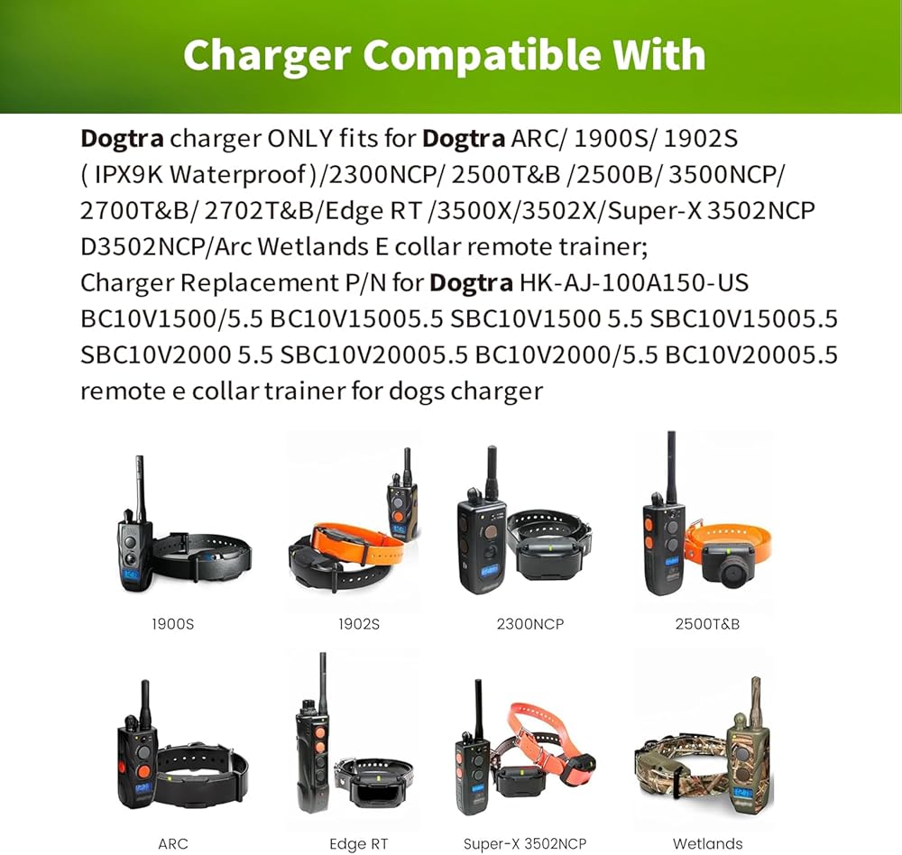 【التوافق: شاحن Dogtra يناسب فقط Dogtra ARC/ 1900S/ 1902S( IPX9K مقاوم للماء)/2300NCP/ 2500T&B /2500B/ 3500NCP/2700T&B/ 2702T&B/Edge RT /3500X/3502X/Super-X 3502NCP D3502NCP/ جهاز تدريب عن بعد ذو ياقة E من Arc Wetlands ; استبدال P/N لـ Dogtra HK-AJ-100A150-US BC10V1500/5.5 BC10V15005.5 SBC10V1500 5.5 SBC10V15005.5 SBC10V2000 5.5 SBC10V20005.5 BC10V2000/5.5 BC10V20005.5 مدرب الياقة الإلكترونية عن بعد شاحن الكلاب