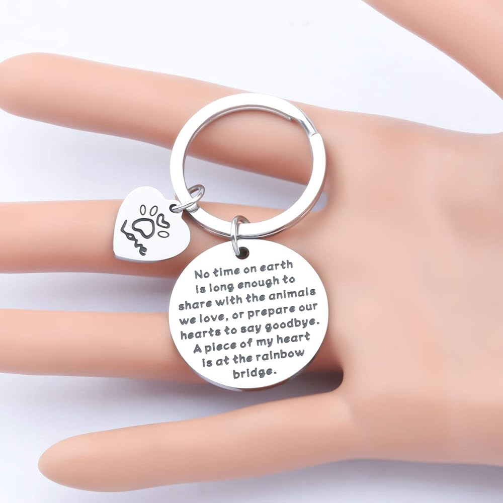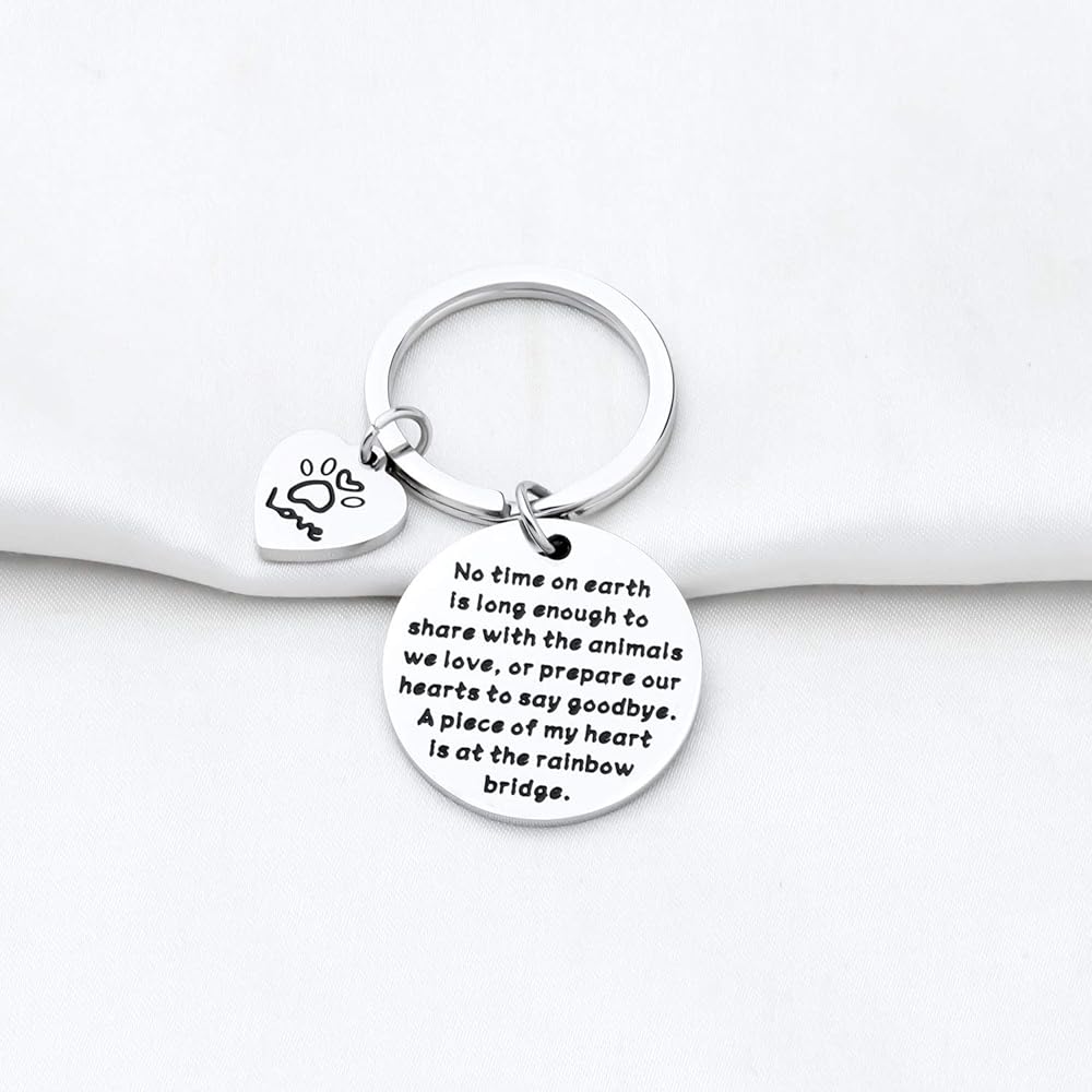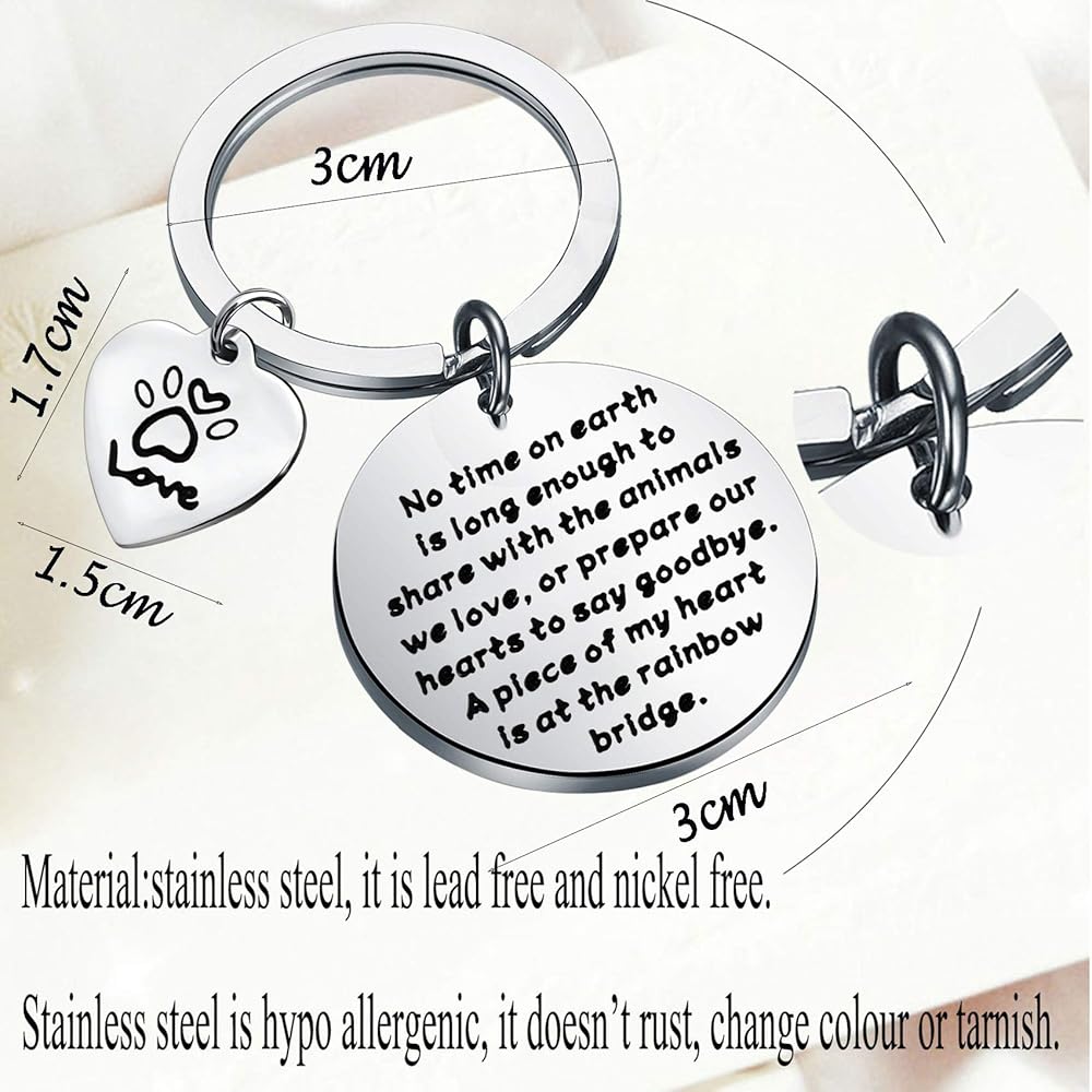 • The keychain with sympathy words "No time on earth is long enough to share with the animals we love, or prepare our hearts to say goodbye. A piece of my heart is at the rainbow bridge", is a special keepsake piece to remember your beloved pet and to honor the memory of a pet - your loyal, loving friend.