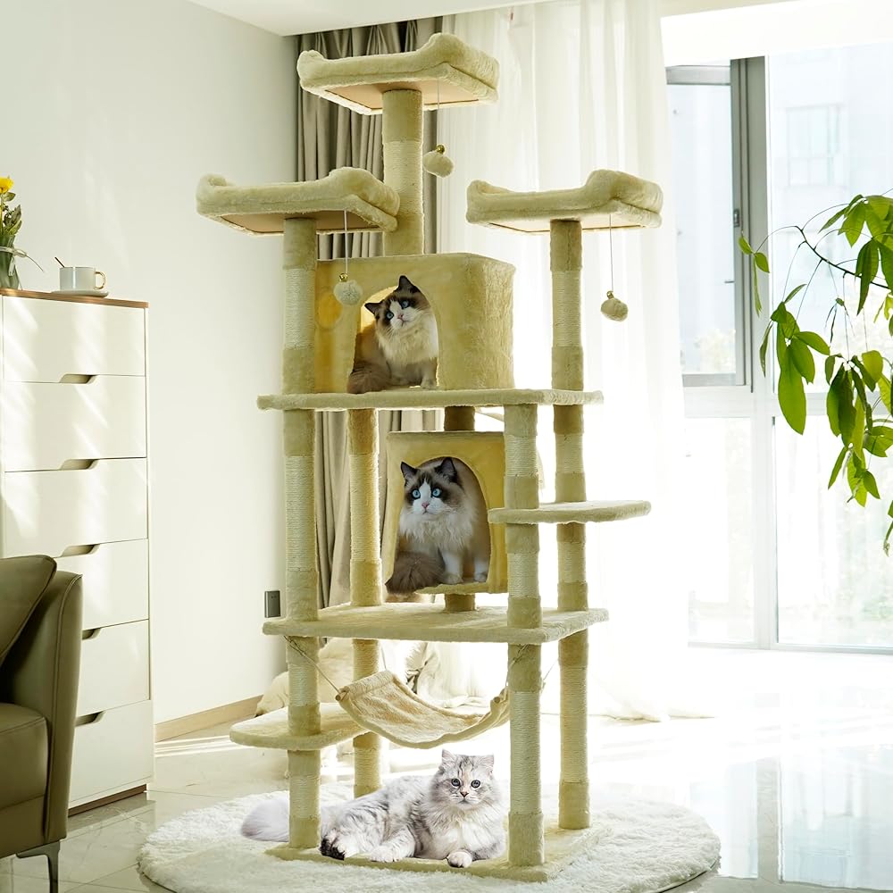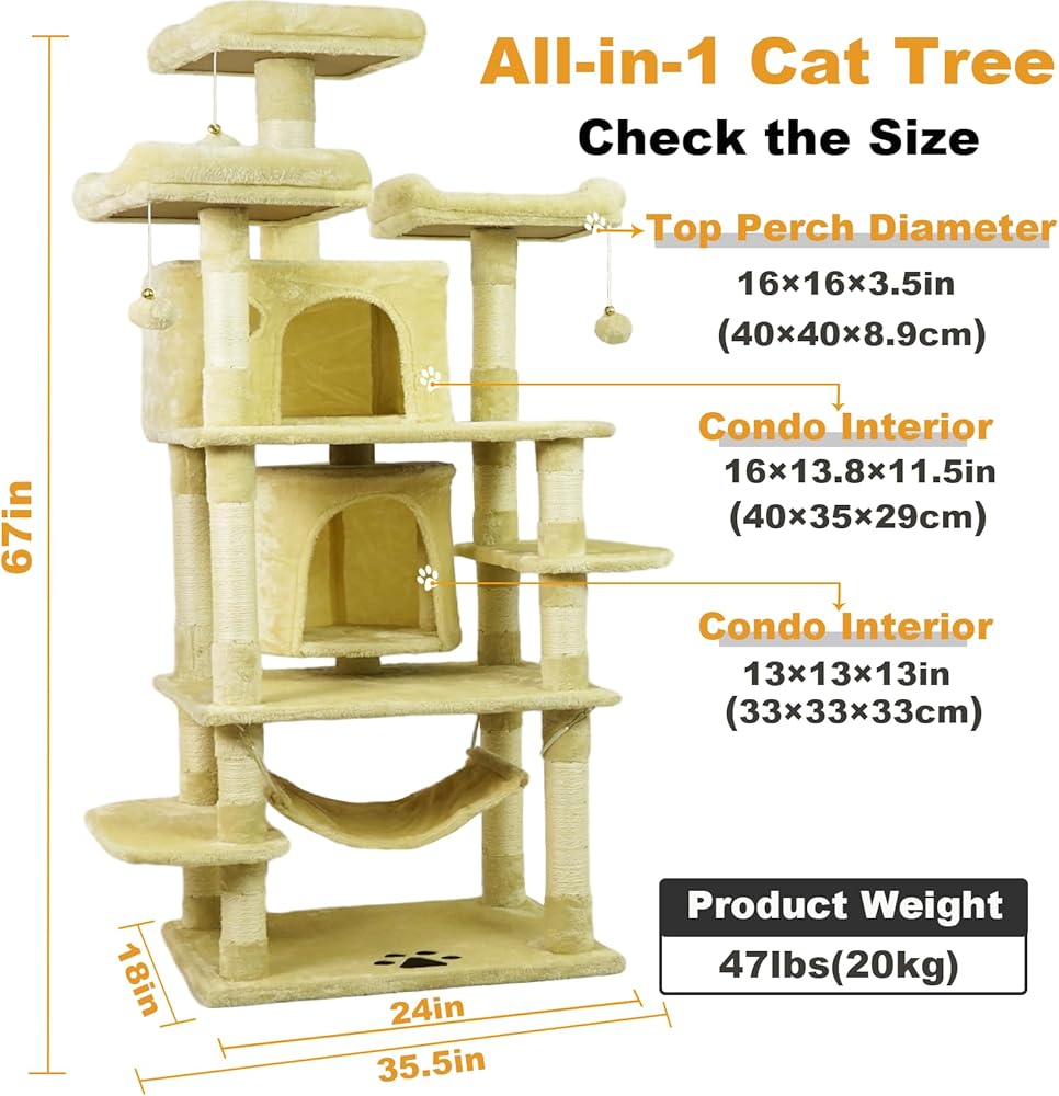 سهل التجميع: مع مفتاح ألين المتوفر، يمكن تجميع برج القطط الكبير هذا للقطط الداخلية بسهولة بواسطة شخص واحد في غضون 30 دقيقة. الأبعاد الإجمالية - 35.5 بوصة طول × 18 بوصة عمق × 67 بوصة ارتفاع (90 × 45 × 170 سم)، مثالية لـ 3 إلى 4 قطط كبيرة/قطط بالغة.