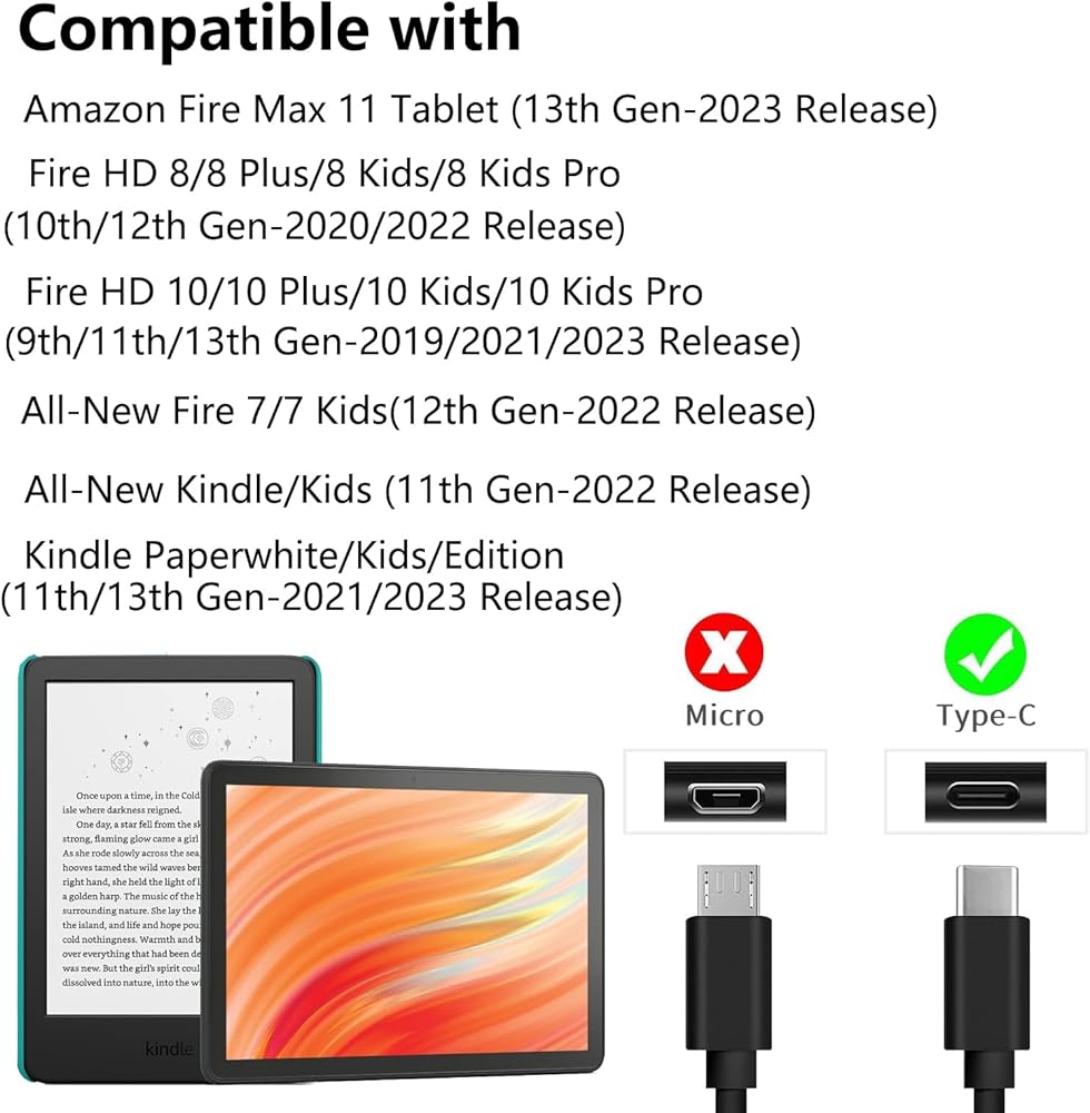 شاحن USB C لجهاز Kindle الجديد (إصدار 2020، 2021، 2022، 2023)، Fire HD 8 10Plus/Kids/Kids Pro، Kindle Paperwhite 11th، Fire Max 11 مع سلك بطول 3FT و6FT من النوع C