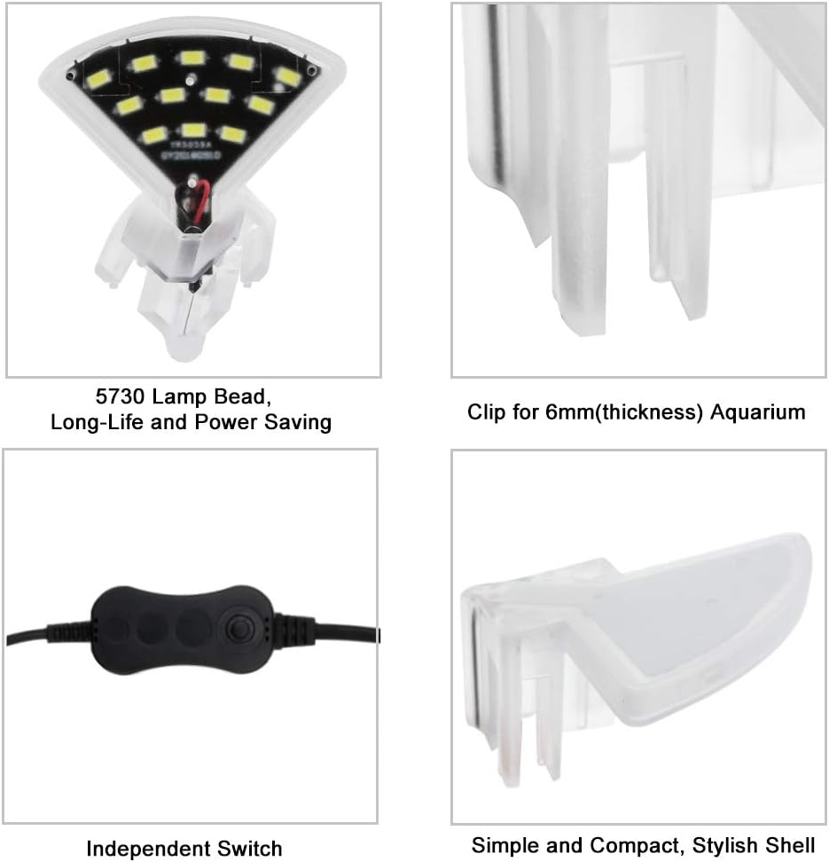 تصميم مقاوم للماء: مصباح بمشبك حوض السمك الصغير غير لامع وشفاف، مع أداء جيد مقاوم للماء، والذي يمكن أن يحافظ على المصباح بعيدًا عن رش الماء والضباب. نحيف وصغير الحجم، يوفر المساحة وسهل التنظيف.