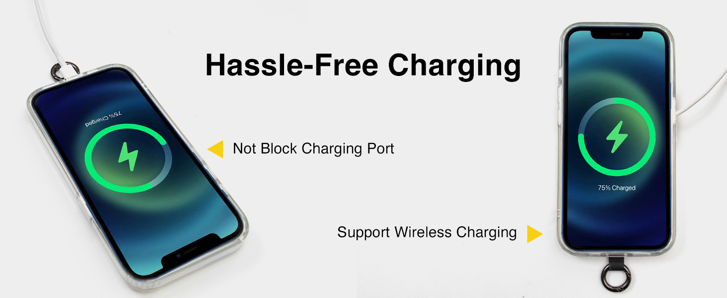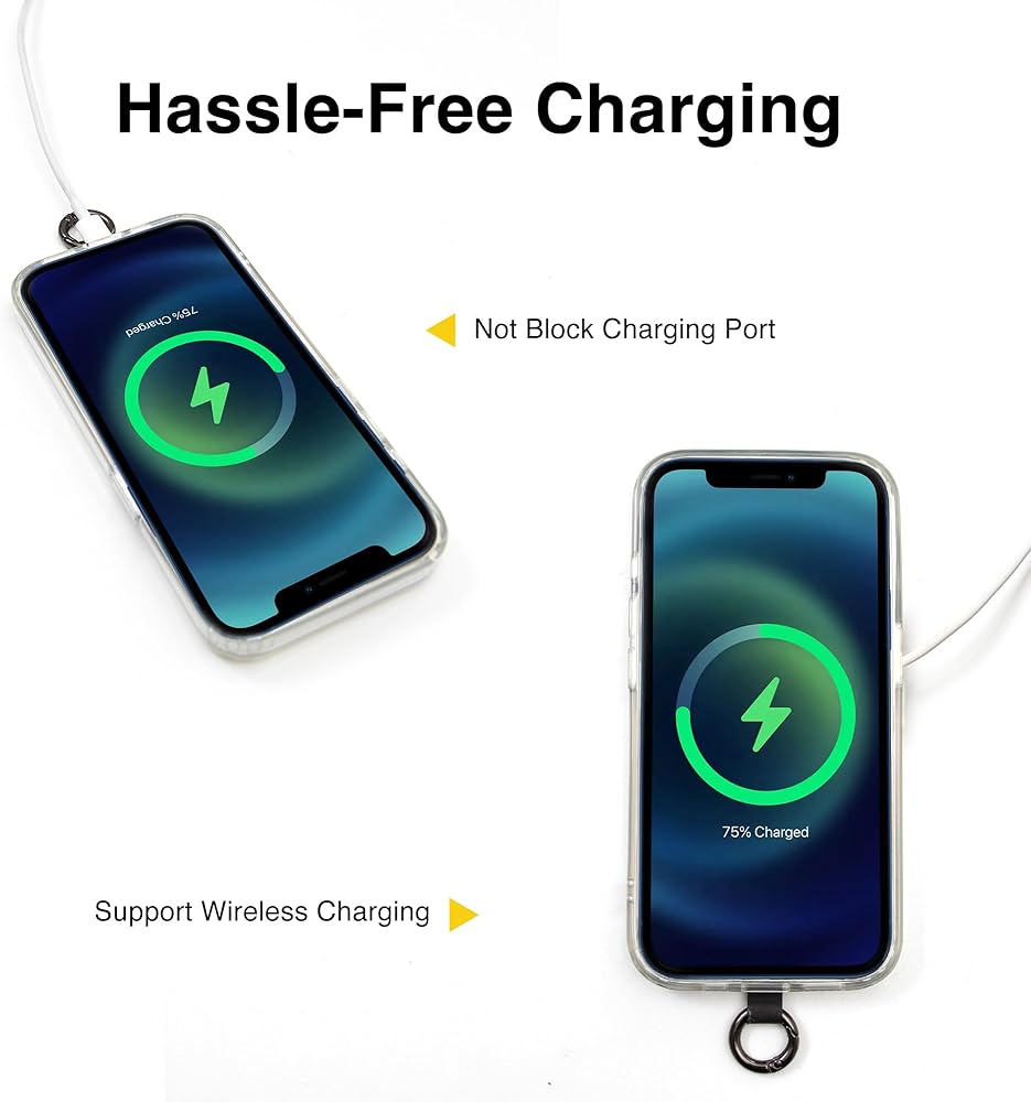 • 【سهلة الاستخدام】سهلة التركيب: قم بتثبيت شريط ربط الهاتف المرح بدون أدوات. ما عليك سوى تمريره عبر منفذ الشحن، وإدخال هاتفك وإرفاق الحبل.