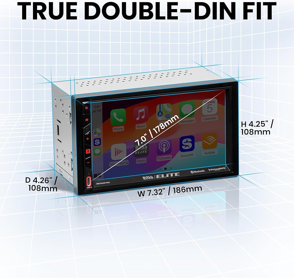 DIMENSIONS: 7.32" x 4.26" x 4.25", Touchscreen Diameter: 7”, Double DIN Mounting Hole Dimensions: 7.01" x 4" x 3.58"