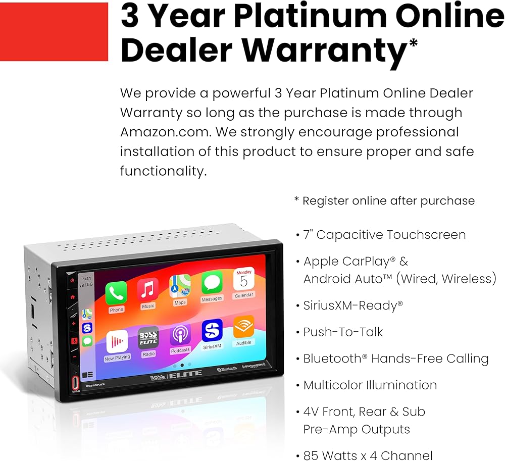 WARRANTY: BOSS Audio Systems provides a powerful 3-year platinum online dealer warranty. We strongly encourage professional installation of this product to ensure proper and safe functionality.