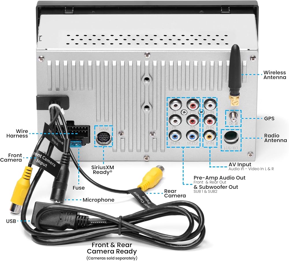 INPUTS/OUTPUTS: Front USB-C Port: Media & 1.5A Charging, Rear USB-A Port: Wireless Apple CarPlay & Android Auto & 1.5A Charging, A/V Input, Front & Rear Camera Inputs, 4V Front, Rear and Sub Pre-Amp Outputs