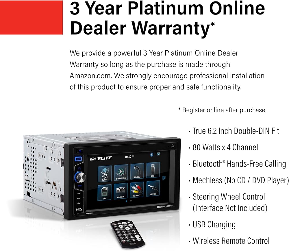 BOSS Audio Systems provides a powerful 3-year platinum online dealer warranty so long as the purchase is made through Amazon.com. We strongly encourage professional installation of this product to ensure proper and safe functionality