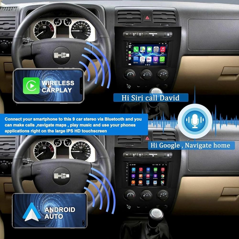 ✅【سلك/لاسلكي IOS CarPlay وAndroid Auto】يتوافق ستيريو شاشة اللمس الحساسة للغاية Hummer H3 مع CarPlay السلكي/اللاسلكي وAndroid Auto، يمكنك بسهولة الحصول على الاتجاهات، وإجراء مكالمات بدون استخدام اليد، وإرسال واستقبال الرسائل، والحصول على Siri /Google Assistant، استمتع بالموسيقى ومقاطع الفيديو والمزيد من خلال جهاز استريو السيارة ذو الشاشة الكبيرة. فهو يوفر طريقة أكثر ذكاءً وأمانًا لاستخدام هاتفك أثناء القيادة. استمتع بالترفيه على الطريق مع أجهزة الاستقبال الصوتية للسيارة Hummer H3 سهلة الاستخدام!