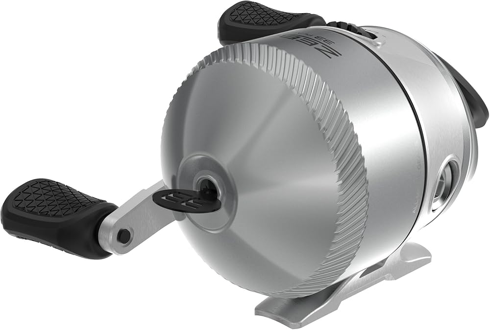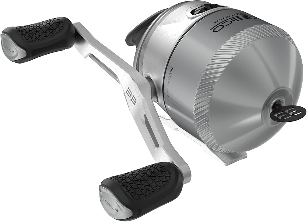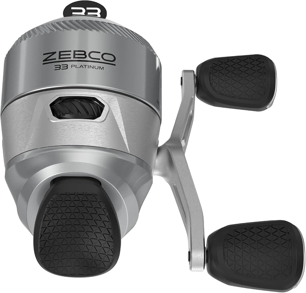 بكرة صيد Zebco 33 Platinum Spincast، مقاس 30 بكرة، استرجاع لليد اليمنى أو اليسرى، نسبة تروس 4.7:1، ملفوفة مسبقًا بخط Zebco Cajun بوزن 10 رطل، فضي