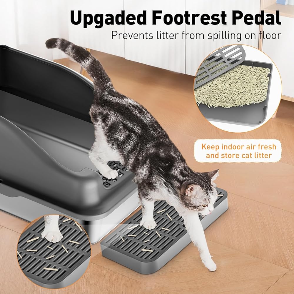 • 【تصميم صندوق فضلات من الفولاذ المقاوم للصدأ مضاد للتتبع】مجهز بدواسة مضادة للتتبع عند الخروج، صندوق الفضلات الخاص بنا بغطاء يمنع الفضلات من الالتصاق بمخالب قطتك وإحداث فوضى في الأرضيات. فضلات القطط المتبقية على الدواسة يمكن أيضًا إعادة استخدامه، مما يوفر المال. بالإضافة إلى ذلك، يحتوي صندوق فضلات القطط المعدني على مغرفة فضلات لتنظيف سهل ومريح. صندوق فضلات القطط المعدني