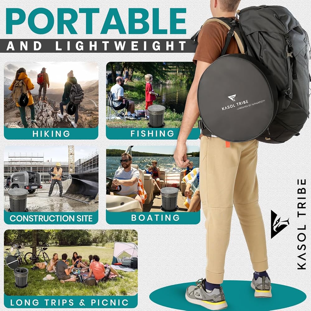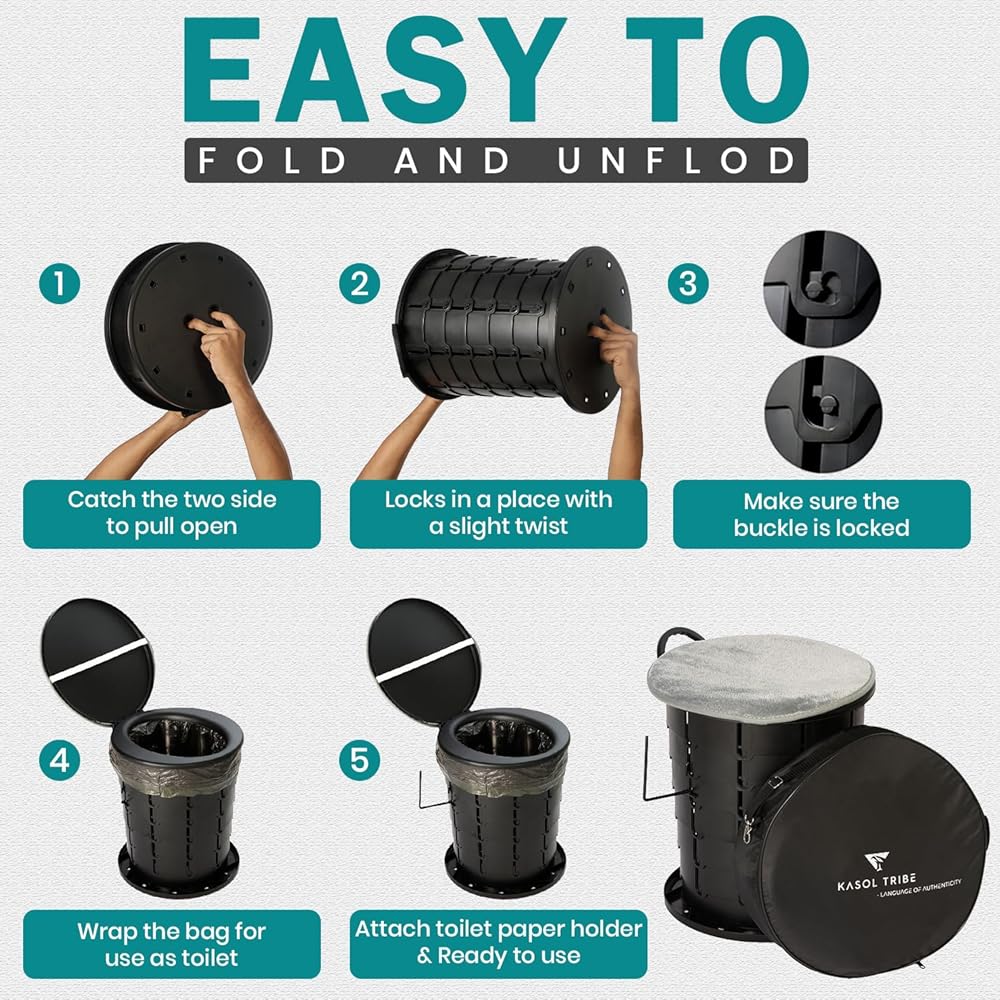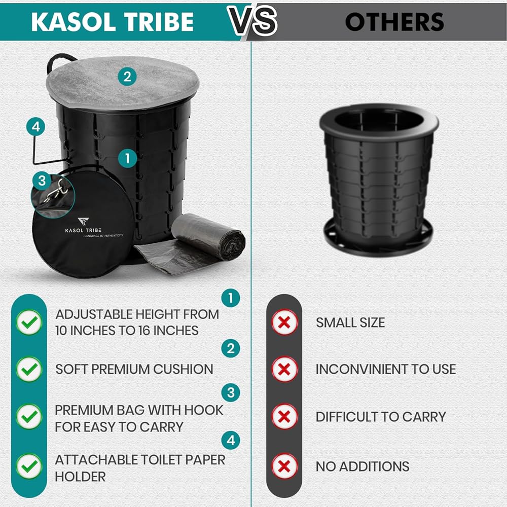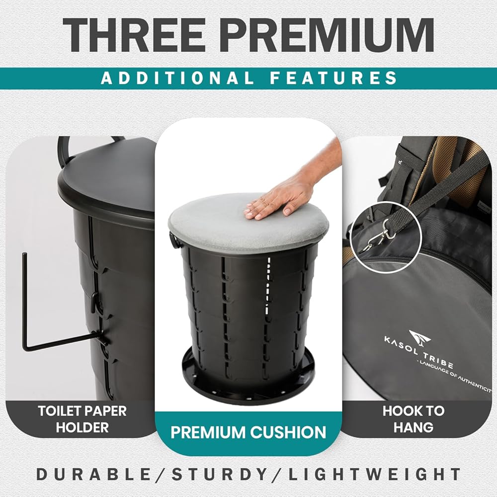 على عكس المنتجات المماثلة الموجودة في السوق، يأتي مرحاض الحمام المحمول KASOL TRIBE مع جميع الملحقات اللازمة لتوفير الراحة والاسترخاء تجربة. سوف تحصل على وسادة مقعد إضافية وقضيب مناديل و5 أكياس قمامة وحقيبة سفر.