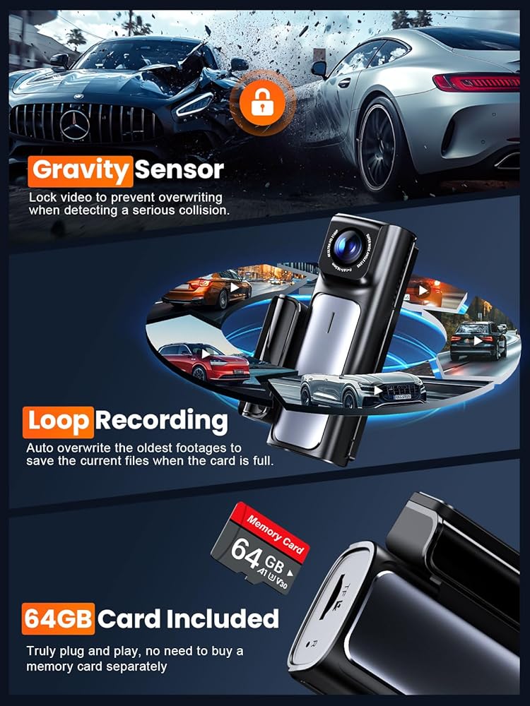 • 【تسجيل حلقة سلسة ومستشعر G 】تسجيل حلقة: يقلل من صيانة الذاكرة عن طريق الكتابة فوق أقدم مقاطع الفيديو تلقائيًا عندما تقترب بطاقة الذاكرة من سعتها. مستشعر الجاذبية: يعمل كشاهد إضافي أثناء الحوادث؛ يقوم مستشعر الجاذبية المدمج ثلاثي المحاور بقفل مقاطع الفيديو وحمايتها من الحذف تلقائيًا في حالة حدوث تصادم خطير، مما يوفر أمانًا إضافيًا لتسجيلاتك.