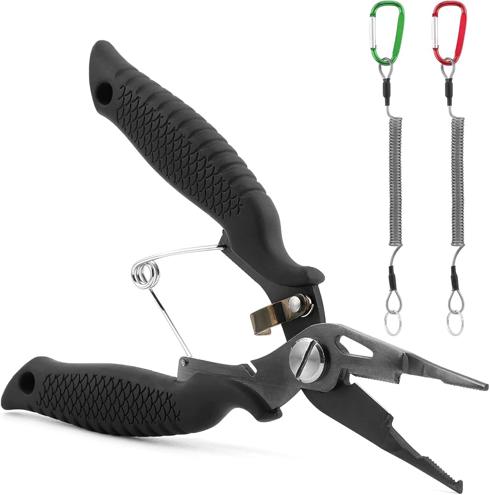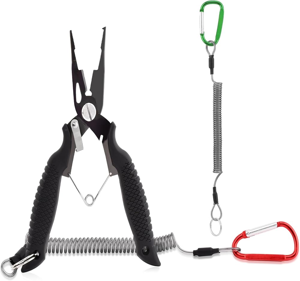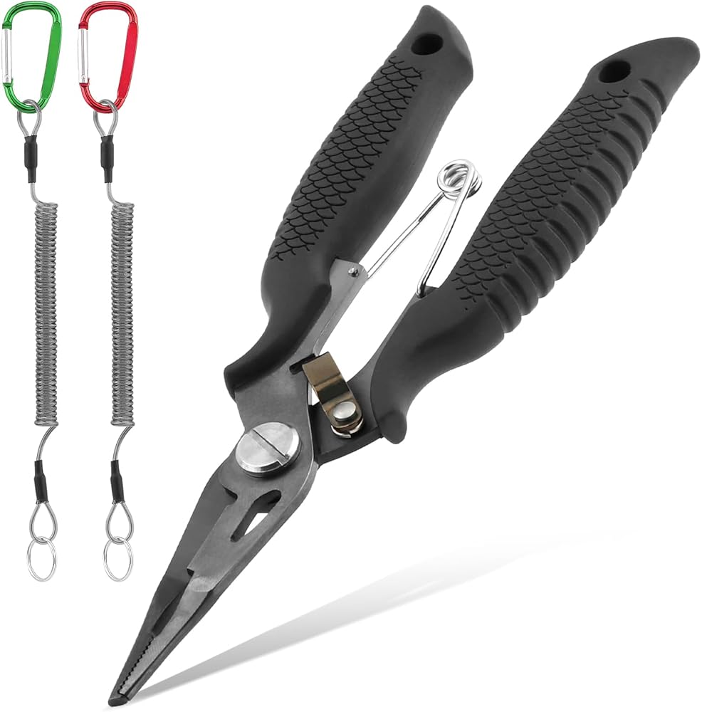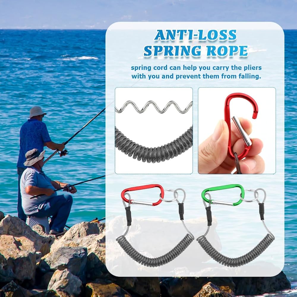 【PACKAGE CONTENT】You will receive 1pc black stainless steel fishing plier, 2pcs different color spiral coil lanyard(red+green, each color 1pc) and 1pc black plier sheath, practical combination set, spring cord can help you carry the pliers with you and prevent them from falling.