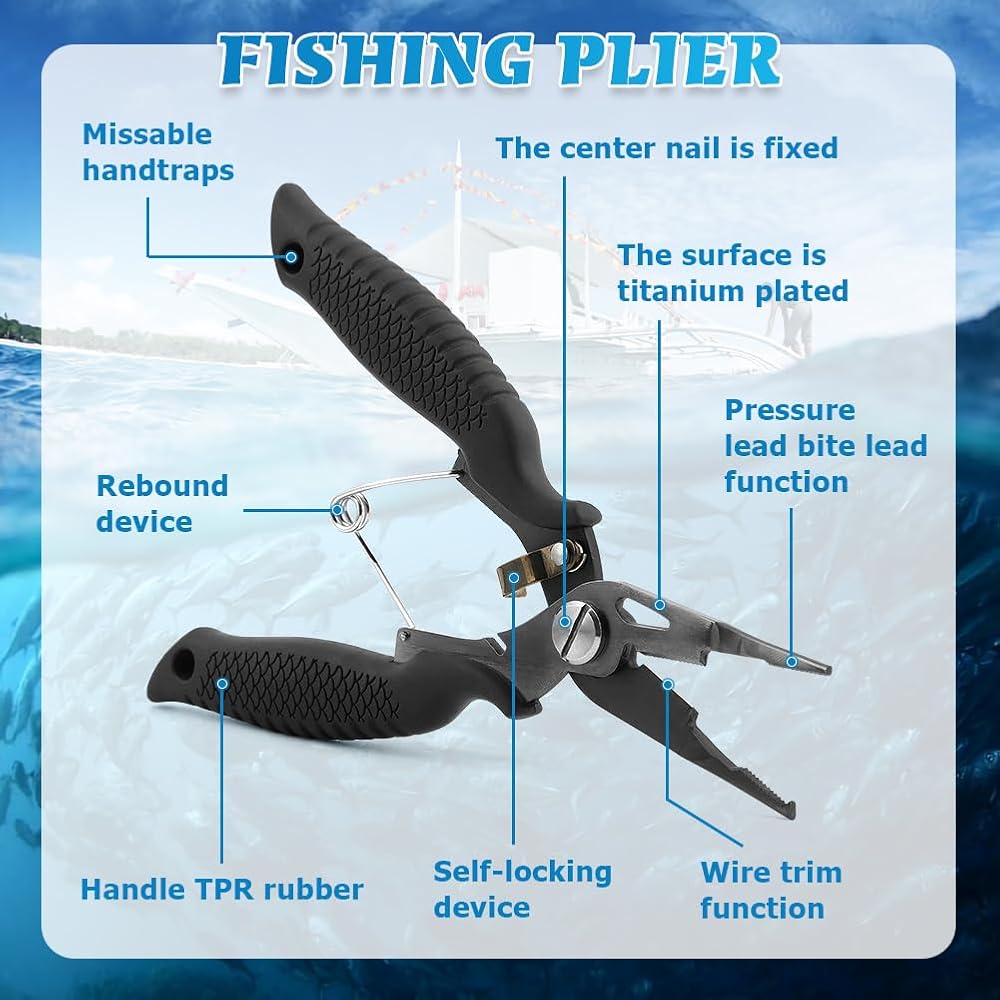 【DURABLE MATERIAL】The fishing plier is made of stainless steel with titanium coating on the surface, high-strength, durable and wear-resistant, not easy to deform or break. Suitable for salt water and fresh water environments.