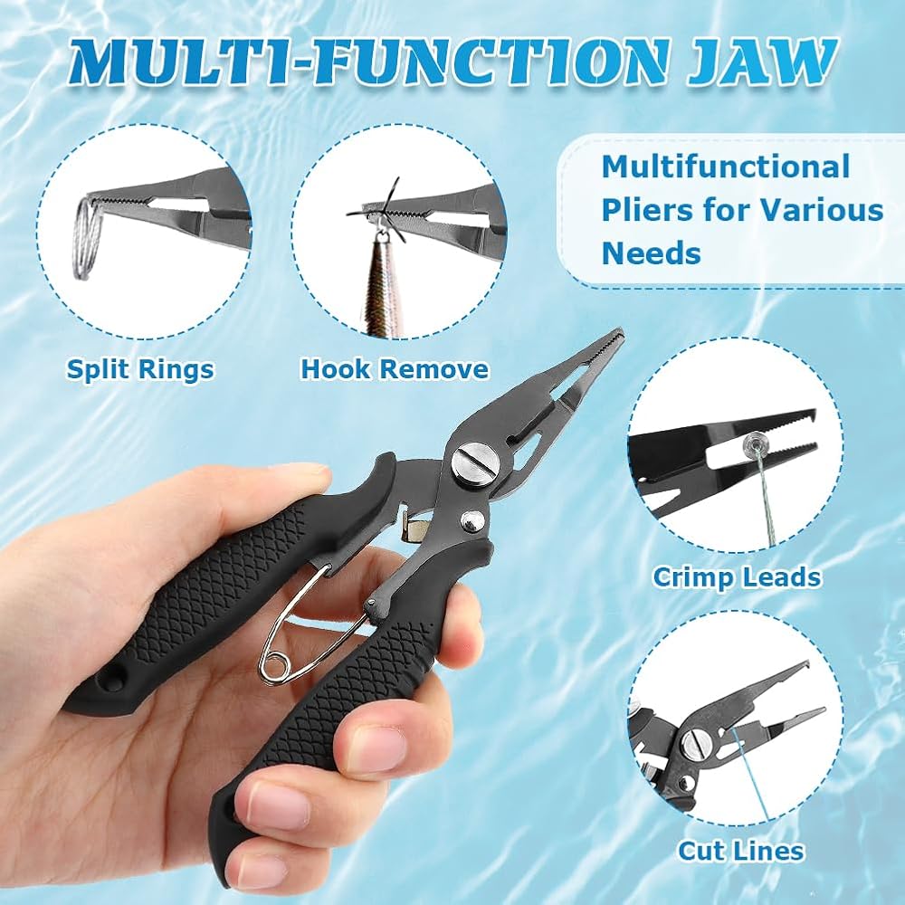 【WIDE APPLICATION】This fishing pliers is versatile, a very practical and convenient fishing accessory, great for removing fish hooks from fish mouths, cutting fishing line/nylon line, opening 2mm small rings, crimping, etc.