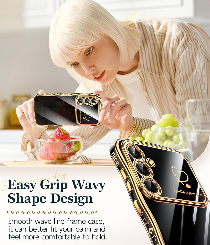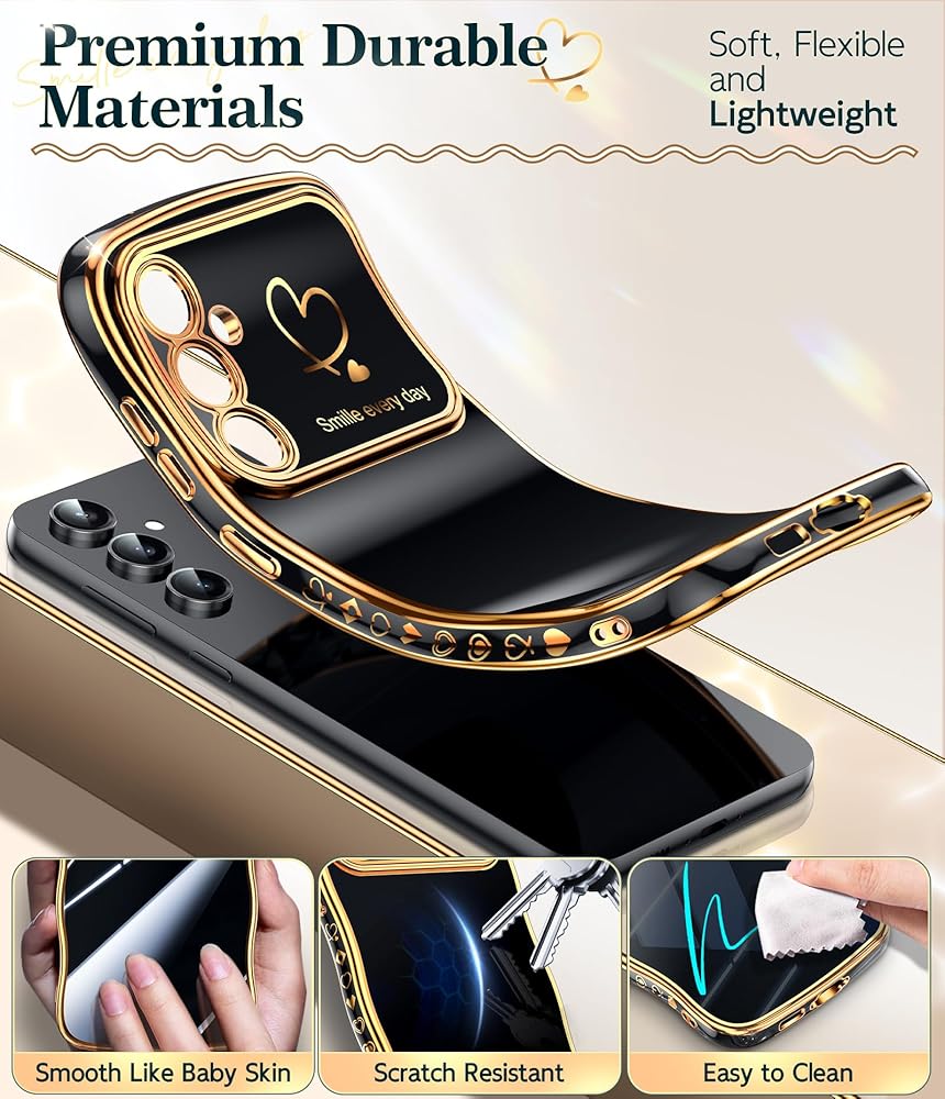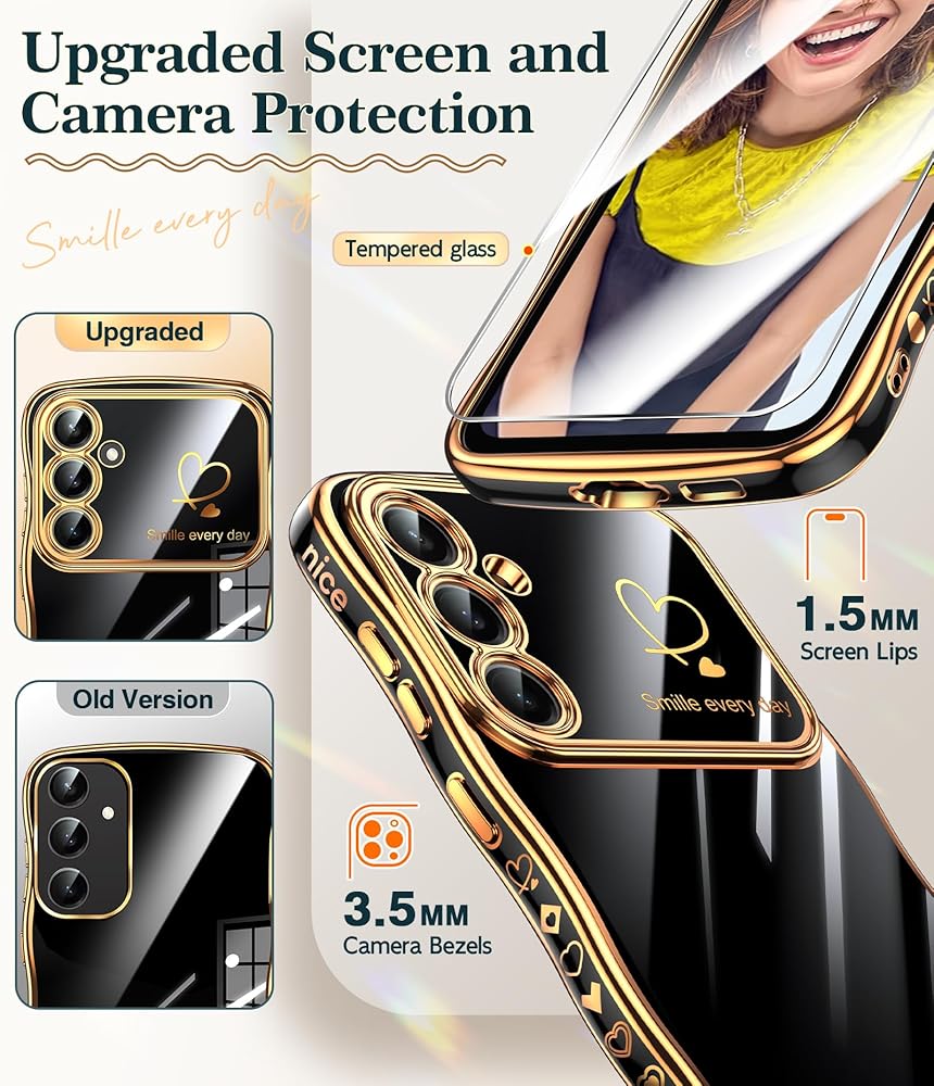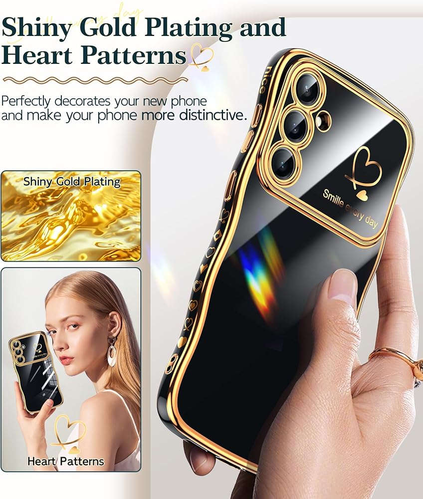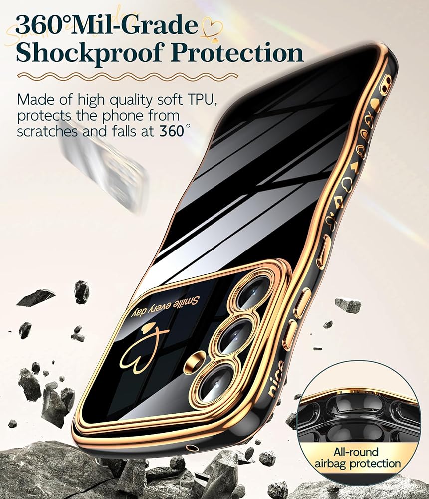 طلاء ذهبي وأنماط قلب: طلاء ذهبي جميل يحيط بأناقة بحواف المصد وحواف الكاميرا مما يجعل الهاتف مليئًا بالفخامة. إطار عدسة الكاميرا والنمط الرقيق على شكل قلب على الجانب يجعل هاتفك أكثر تميزًا