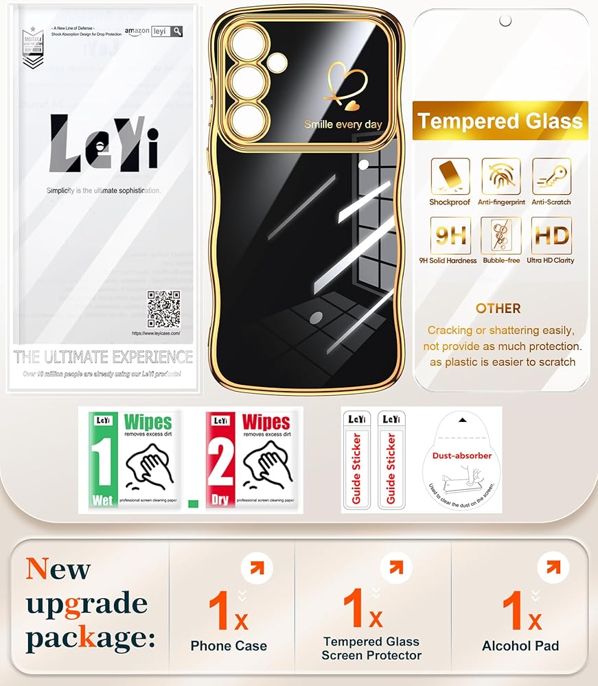 حافظة LeYi لهاتف Samsung Galaxy S23-FE: مع واقي شاشة زجاجي، حماية كاملة للكاميرا مموجة فاخرة مطلية بحافة ذهبية على شكل قلب لطيف بناتي مقاوم للصدمات Samsung S23FE، أسود