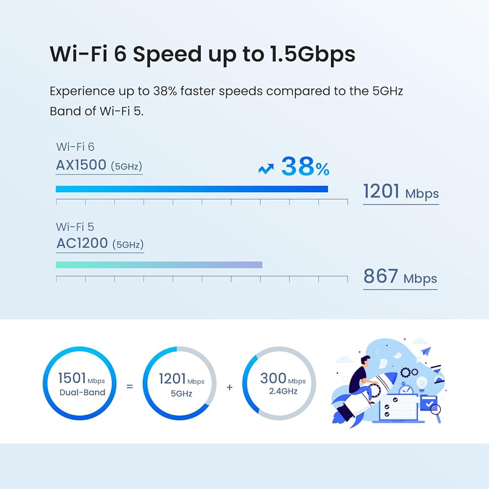 𝐃𝐮𝐚𝐥-𝐁𝐚𝐧𝐝 𝐖𝐢-𝐅𝐢 𝟔 𝐌𝐞𝐬𝐡 𝐀𝐗𝟏𝟓𝟎𝟎 — استمتع ببث وألعاب وتنزيل أكثر سلاسة واستقرارًا مع سرعات Wi-Fi تصل إلى 1.5 جيجابت في الثانية (1201 ميجابت في الثانية على نطاق 5 جيجاهرتز و300 ميجابت في الثانية على نطاق 2.4 جيجاهرتز)