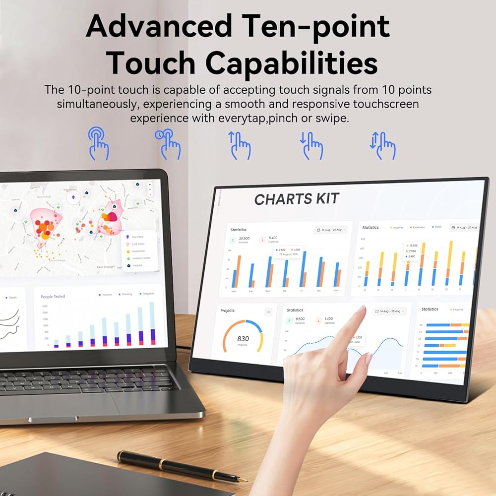 شاشة لمس سعوية: شاشة محمولة تعمل باللمس مقاس 16 بوصة تتميز بلوحة لمس سعوية ذات 10 نقاط مع إمكانيات اللمس المتعدد، مما يوفر لك تجربة لمس دقيقة للغاية وسريعة الاستجابة وسلسة تستجيب بسرعة بلمسة واحدة. يوفر وضع HDR ألوانًا أعمق وأكثر واقعية لتجربة بصرية رائعة. التوصيل والتشغيل، لا حاجة إلى برنامج تشغيل إضافي، تتطلب شاشة اللمس USBC كابل USBC واحدًا لتوصيلها بالكمبيوتر أو الهاتف أو الجهاز اللوحي دون أي إعدادات مرهقة.