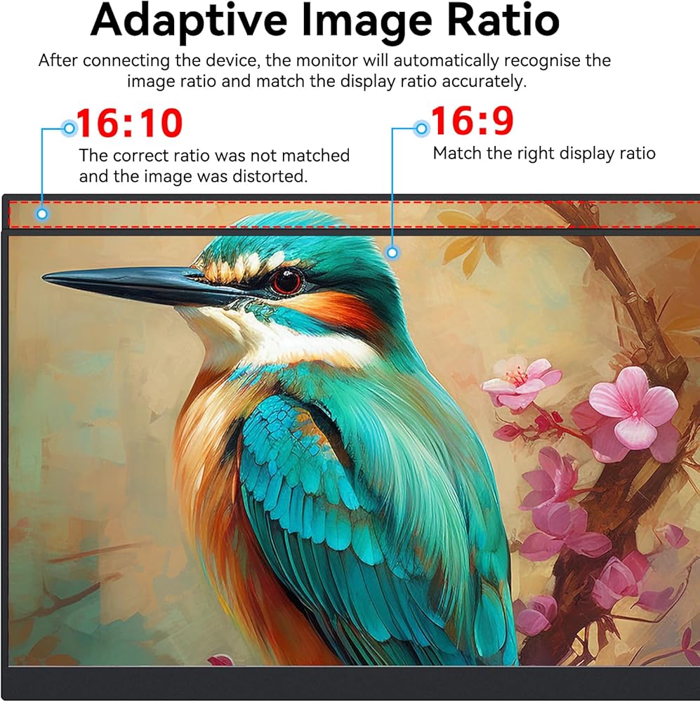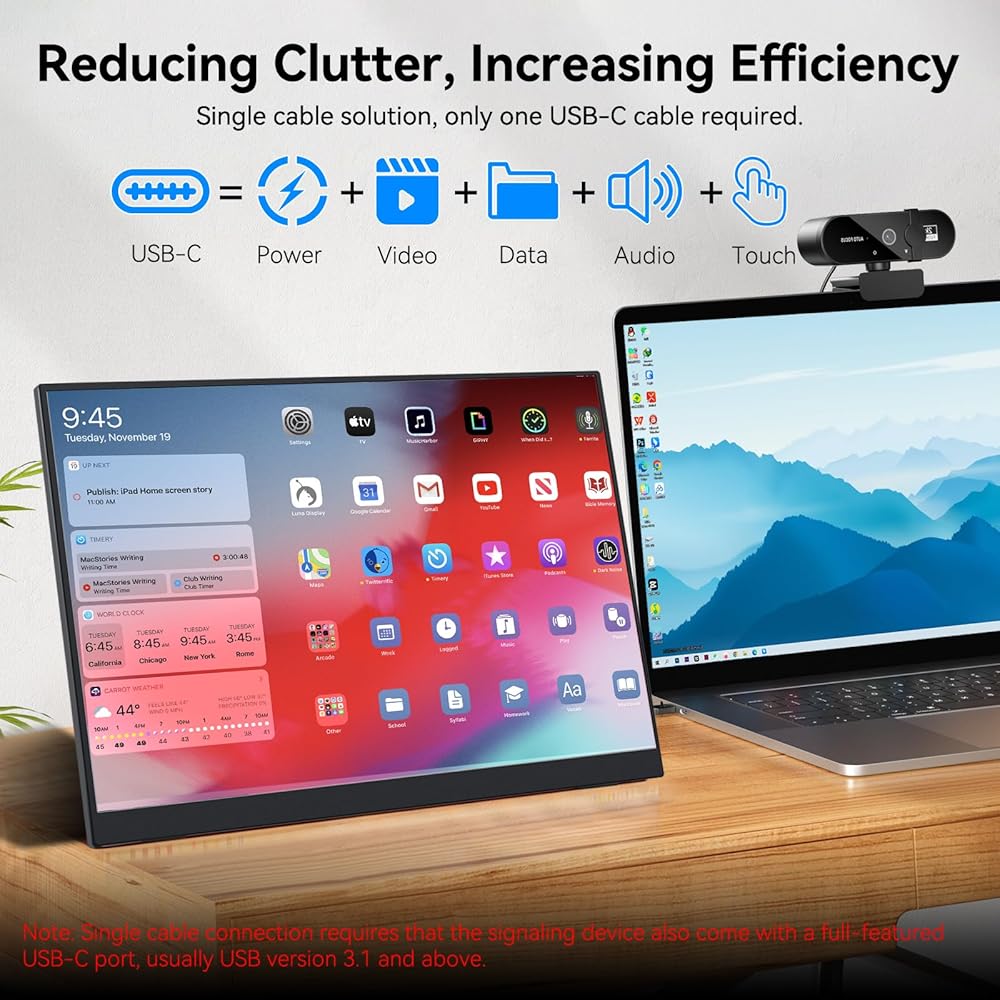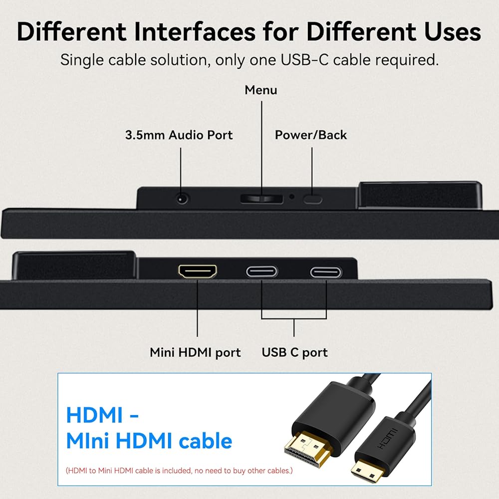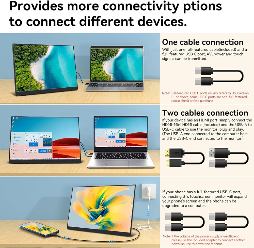 توافق واسع: تأتي هذه الشاشة المحمولة مع منفذ HDMI صغير و2 إصدار USB C كامل المواصفات 3.1، تحقق بسهولة نقل إشارة اللمس والصوت/الفيديو من خلال كابل USB C واحد، أو استخدم كابل HDMI الصغير المتضمن إلى كابل HDMI وكابل USB A. قم بتوصيله بمجموعة متنوعة من الأجهزة لتلبية سيناريوهات الاستخدام المختلفة.