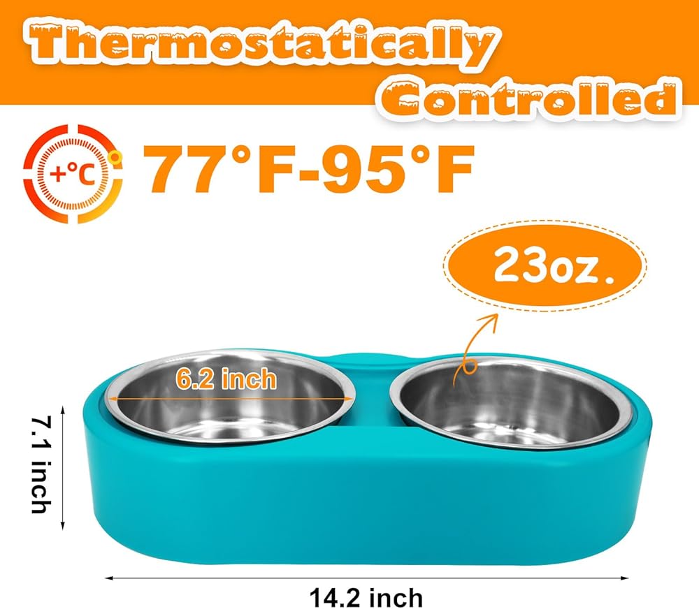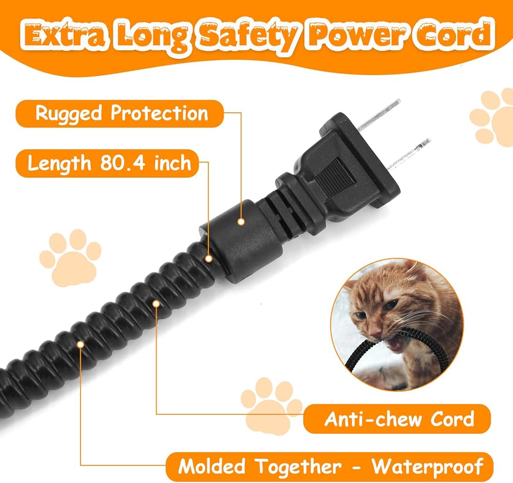 🐰【سلك أمان مضاد للمضغ】: سلك الطاقة الممتد المغطى بالفولاذ مقاس 80.4 بوصة يمنع الحيوانات الأليفة من المضغ ويطيل عمر الوعاء. تعمل أوعية طعام القطط الخارجية التي تعمل بقدرة 42 وات فقط، وتوفر حلاً آمنًا ومنخفض الطاقة للحفاظ على برودة ماء وطعام حيوانك الأليف.