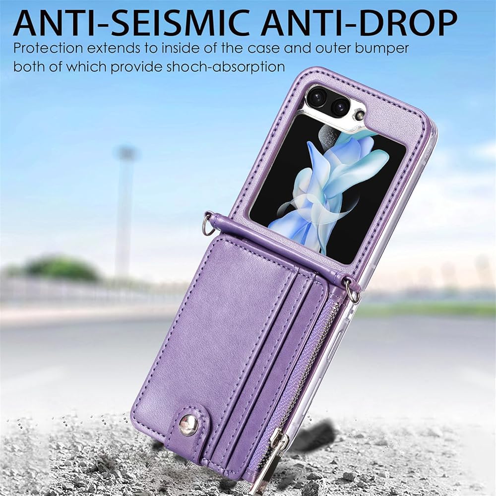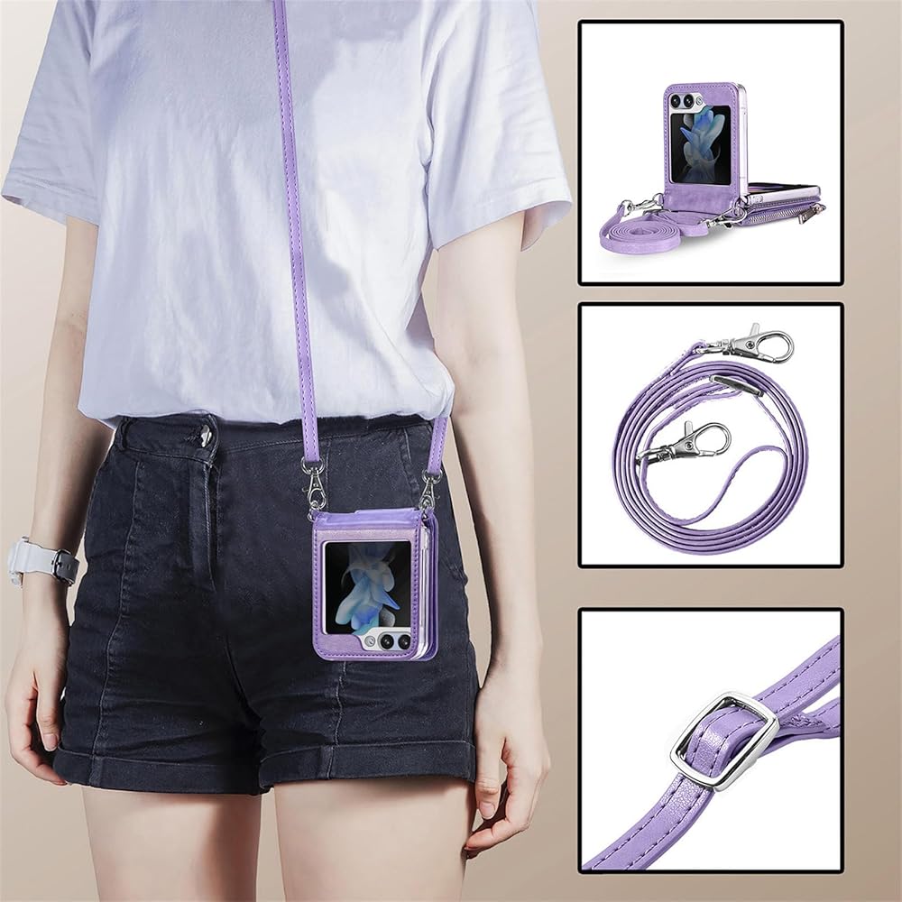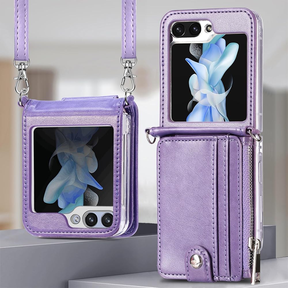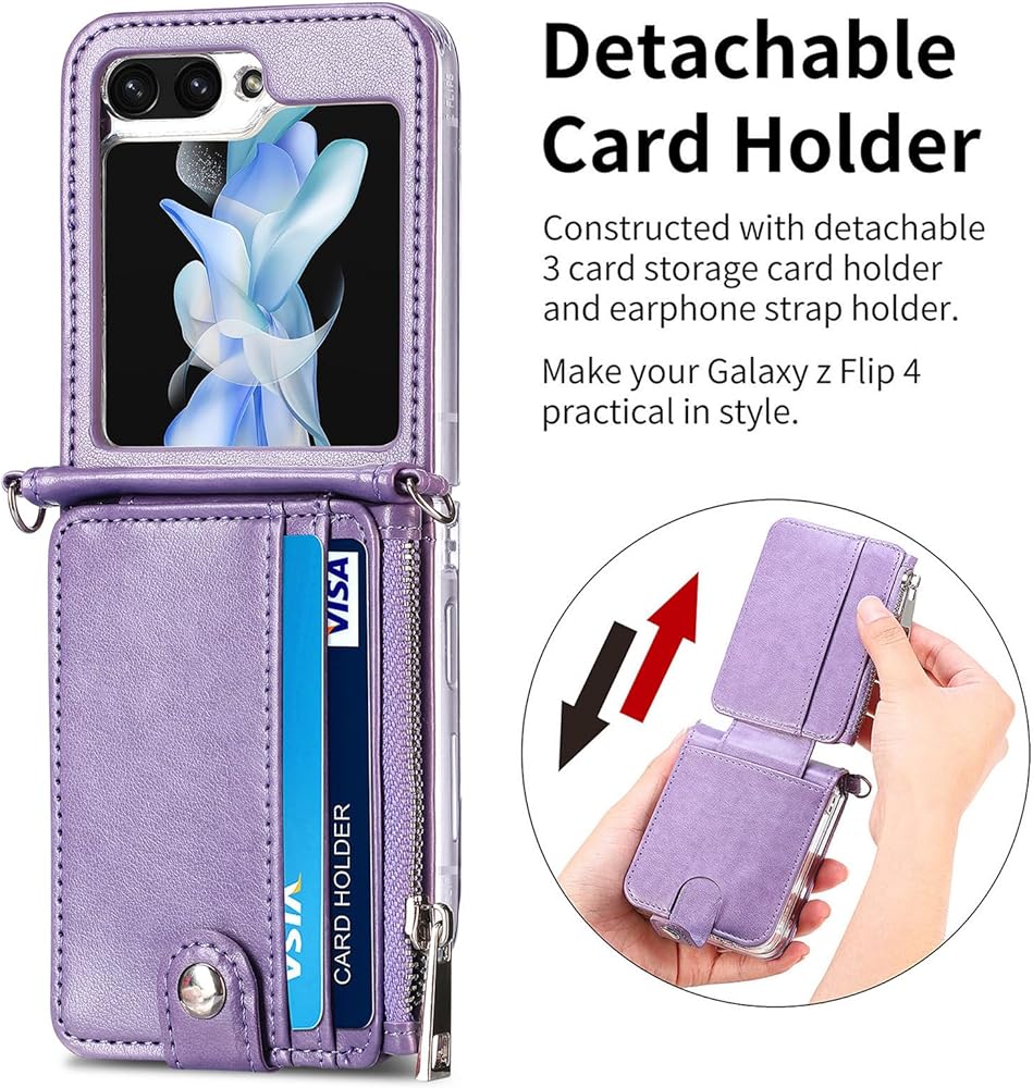 SooPii PU Leather Case for Samsung Galaxy Z Flip 6, Zipper Storage Design,Detachable Anti Slip Crossbody Strap and Card Holder,Full Coverage Phone Cover for Flip 6 Case,Purple
