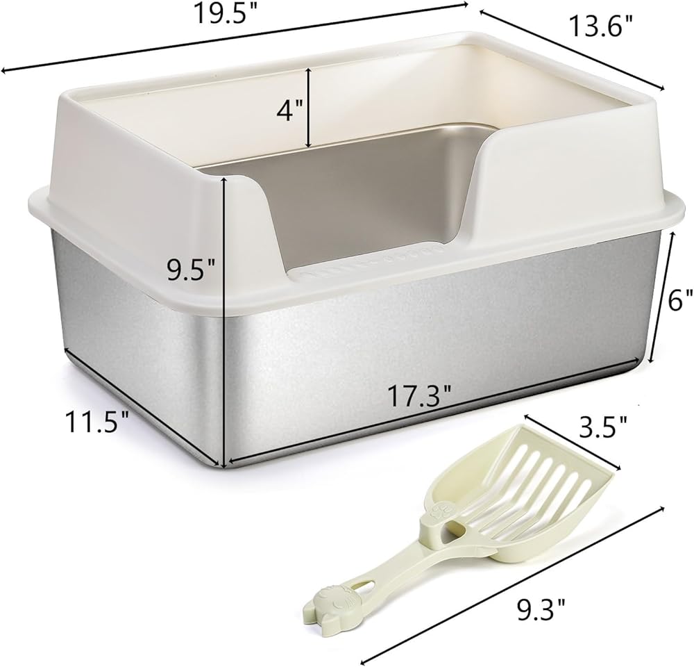 حجم كبير: يبلغ مقاس صندوق الفضلات الكبير المصنوع من الفولاذ المقاوم للصدأ 19.5 × 13.6 × 9.5 بوصة (إجمالي)، والعرض الداخلي للجزء السفلي 11.5 بوصة، والطول الداخلي للجزء السفلي 17.3 بوصة. رائعة للقطط كثيرة التبول، حيث توفر مساحة واسعة للقطط الكبيرة بينما تكون مناسبة للقطط من جميع الأحجام، كما أن الحجم الكبير جدًا يجعلها الخيار الأفضل للأسر التي لديها قطط متعددة.