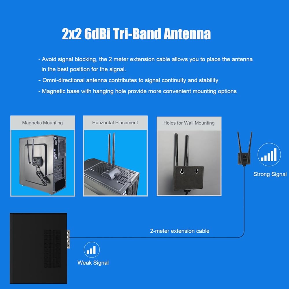 هوائي ثلاثي الموجات 2x2 6dBi متعدد الاتجاهات: يقلل من البقع الميتة للإشارة باستخدام كابل تمديد بطول 2 متر. يتم ربط القاعدة المغناطيسية باللوحة الجانبية لحافظة الكمبيوتر الخاص بك دون أن تشغل مساحة على سطح المكتب. يمكنك وضع الهوائي بحرية في المكان الأمثل لاستقبال الإشارة.