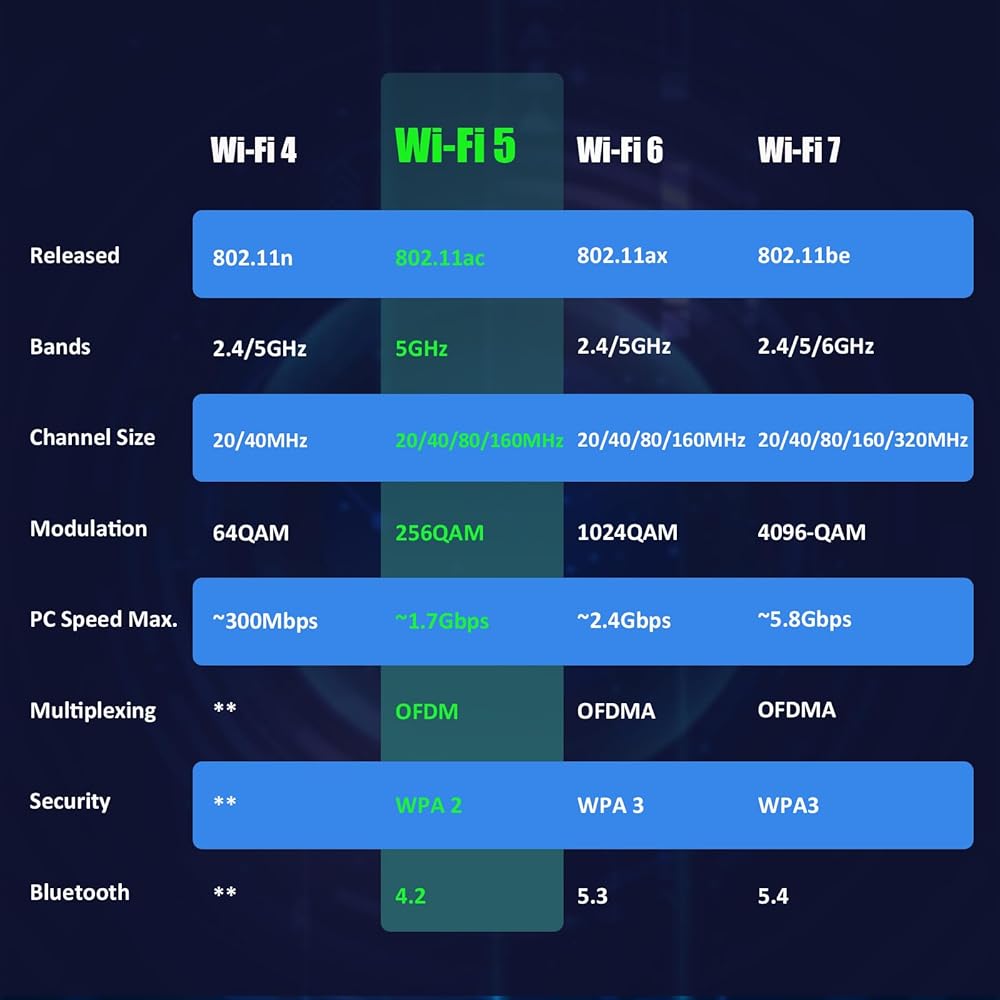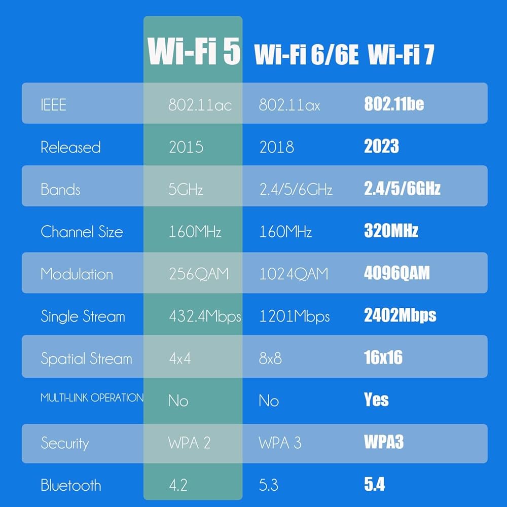 ميزات Wi-Fi 7: 1) قنوات 320 ميجاهرتز؛ 2) 4K-QAM؛ 3) تشغيل متعدد الارتباطات، وما إلى ذلك. يبلغ حجم قنوات 320 ميجاهرتز ضعف حجم أجيال Wi-Fi السابقة. يمكن أن يحقق 4K-QAM في Wi-Fi 7 زيادة في معدل 20% مقارنةً بـ 1024-QAM في Wi-Fi 6