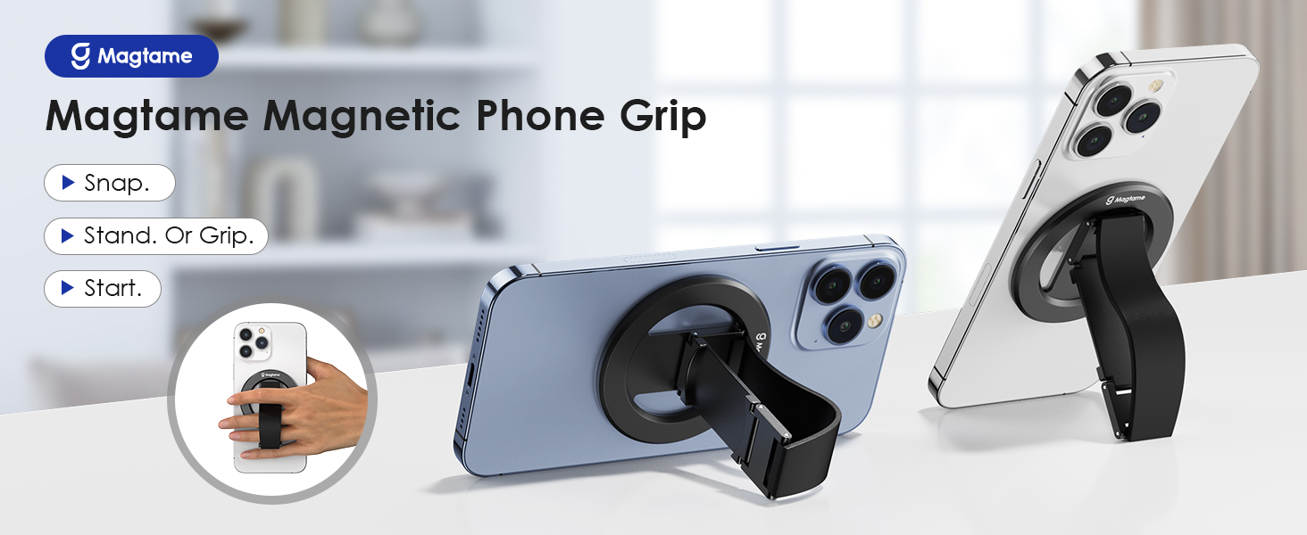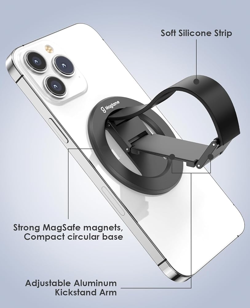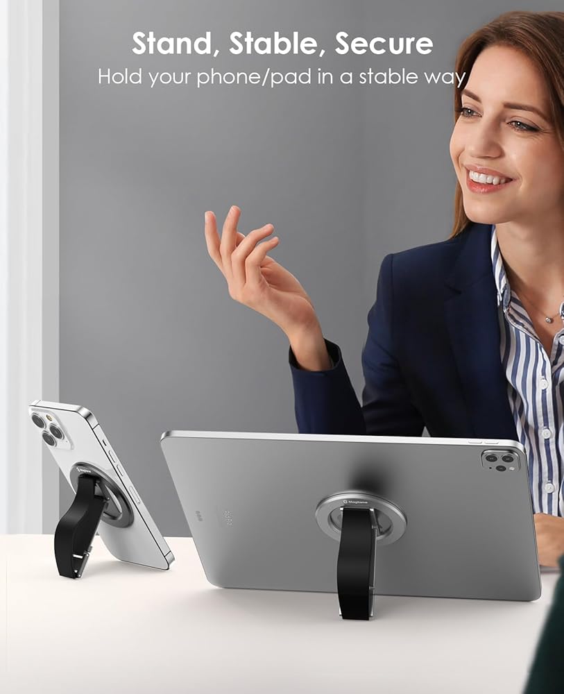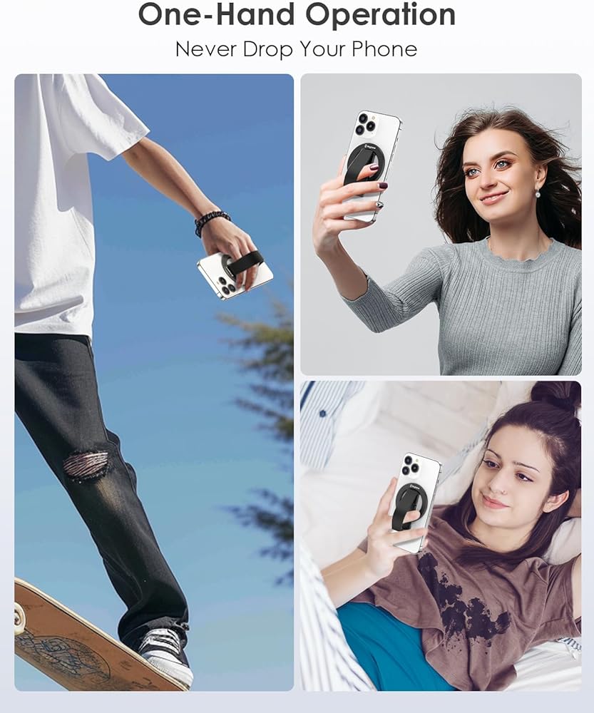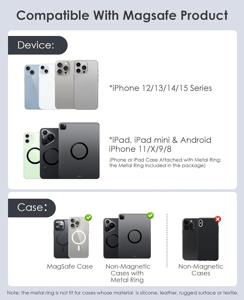 التوافق على نطاق واسع: توافق مقبض الهاتف المغناطيسي Magtame مع سلسلة iPhone 12/13/14/15 ولحافظة الهاتف MagSafe. فقط قم بإرفاقه مباشرة. مناسب أيضًا للهواتف/الأجهزة اللوحية/الحافظات غير المغناطيسية، فقط قم بتوصيل الحلقة المعدنية (المضمنة في العبوة) بحافظة هاتفك قبل الاستخدام.