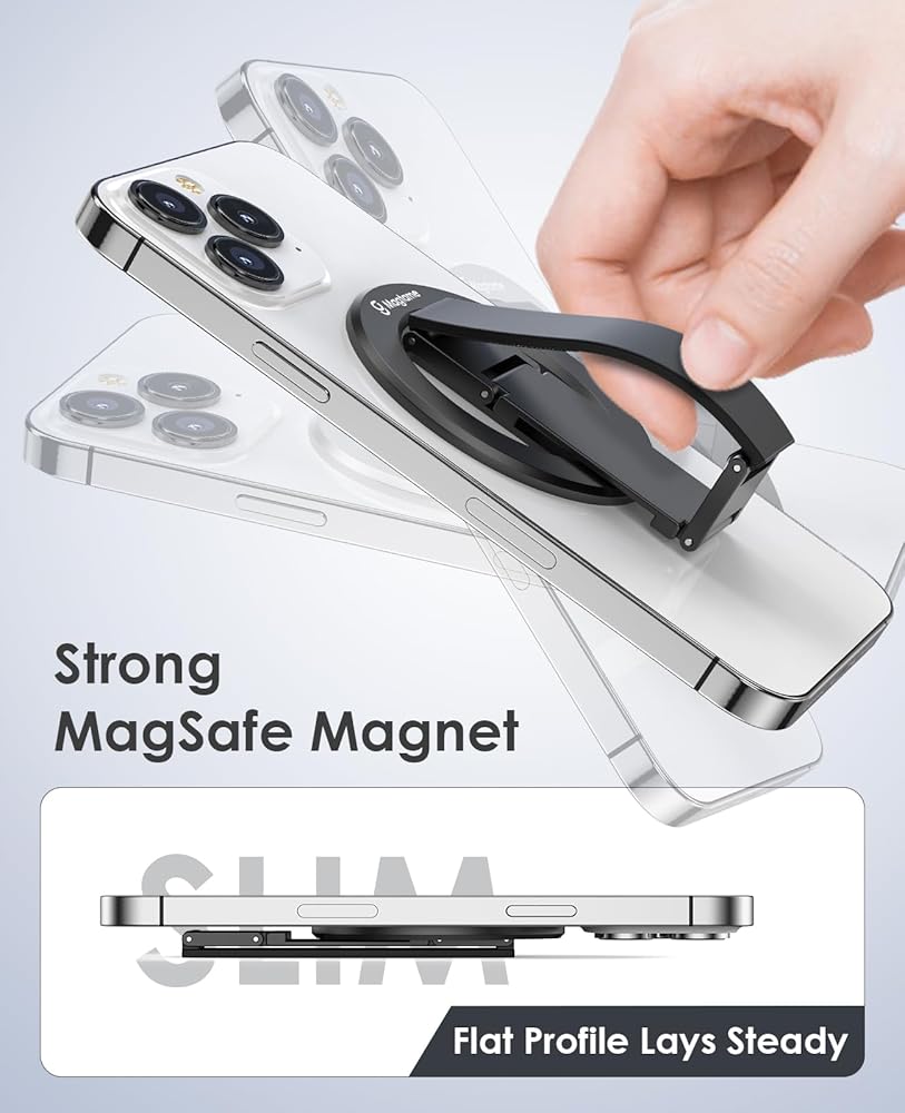 سهولة التركيب والخلع: قم بتثبيته على هاتفك للحصول على مسند آمن للهاتف مزود بمغناطيسات قوية. عندما يحين وقت شحن هاتفك بالشاحن اللاسلكي، ما عليك سوى إزالته دون أي بقايا لزجة - مما يجعل حياتك بسيطة وخالية من المتاعب!