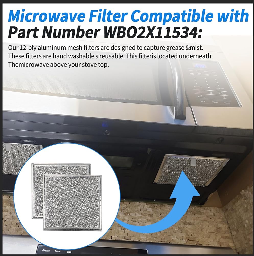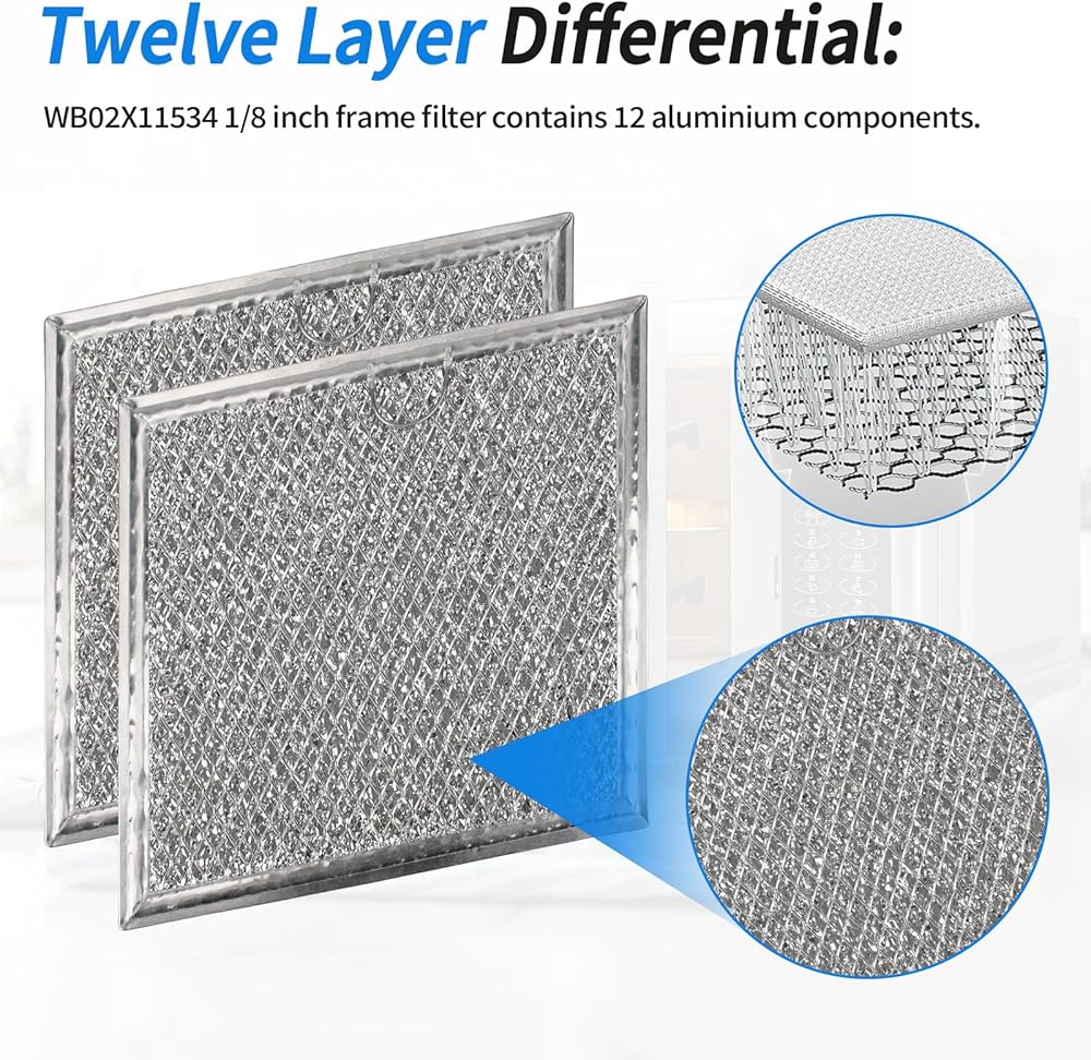 Part Number – WB02X11534 Microwave Grease Filter Replacements For Microwave Oven. 12-Layer Aluminum Grease Filter Replacement. Package Contains 2-Filters For Easy Replacement, Filters Are Packaged In a Durable Chipboard Envelope To Prevent Possible Damage In Transit