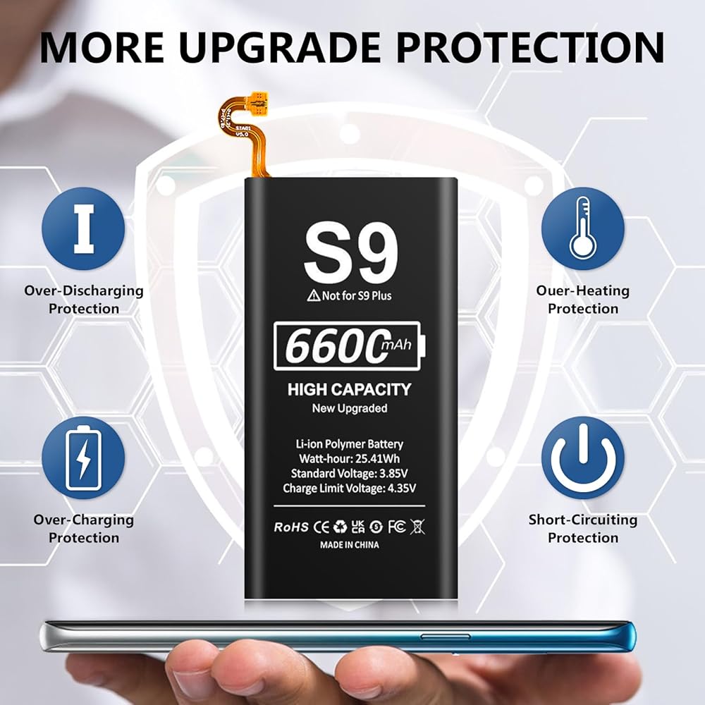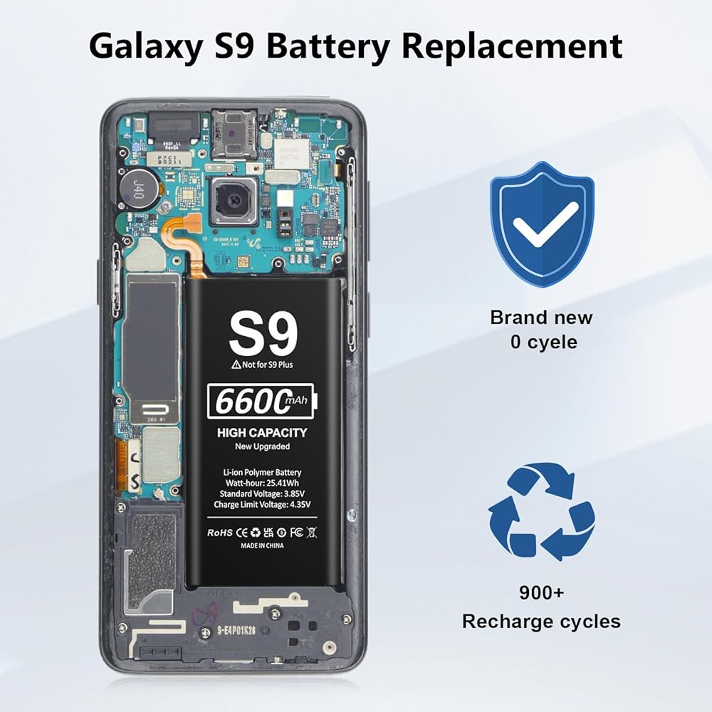【سعة أعلى بنسبة 120% من البطارية الأصلية】 استبدال بطارية سامسونج S9 بقدرة عالية 6600 مللي أمبير في الساعة بسعة أعلى بنسبة 120% من البطارية الأصلية، تم ترقية سعة خلية البطارية الجديدة تمامًا 0 دورة لتخزين المزيد من الطاقة، وتوفير المزيد من وقت الاستعداد، وزيادة عمر البطارية وتقليل عمر البطارية. أوقات إعادة الشحن.