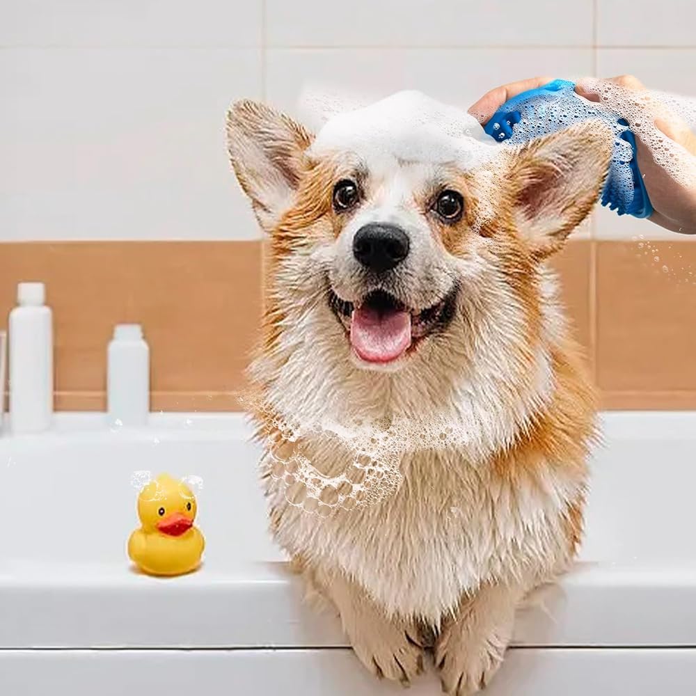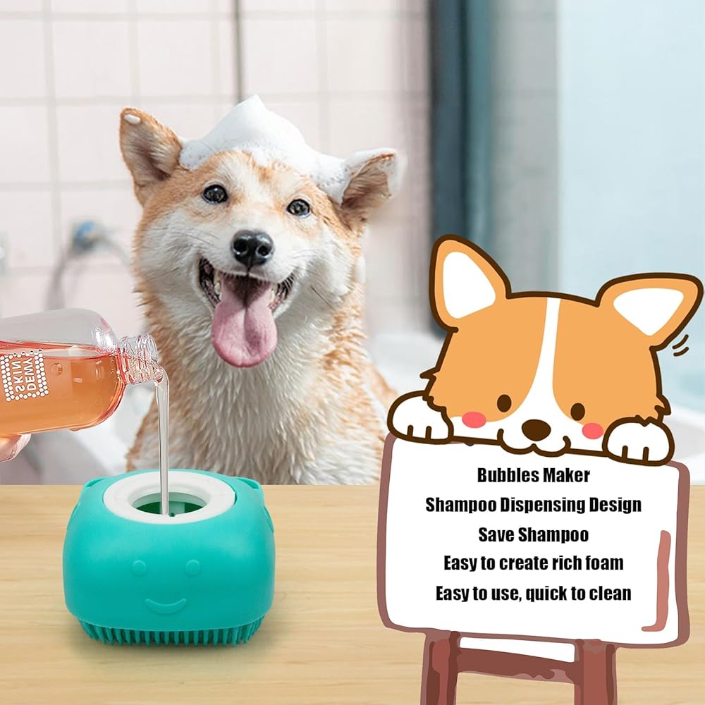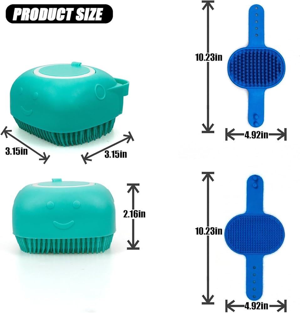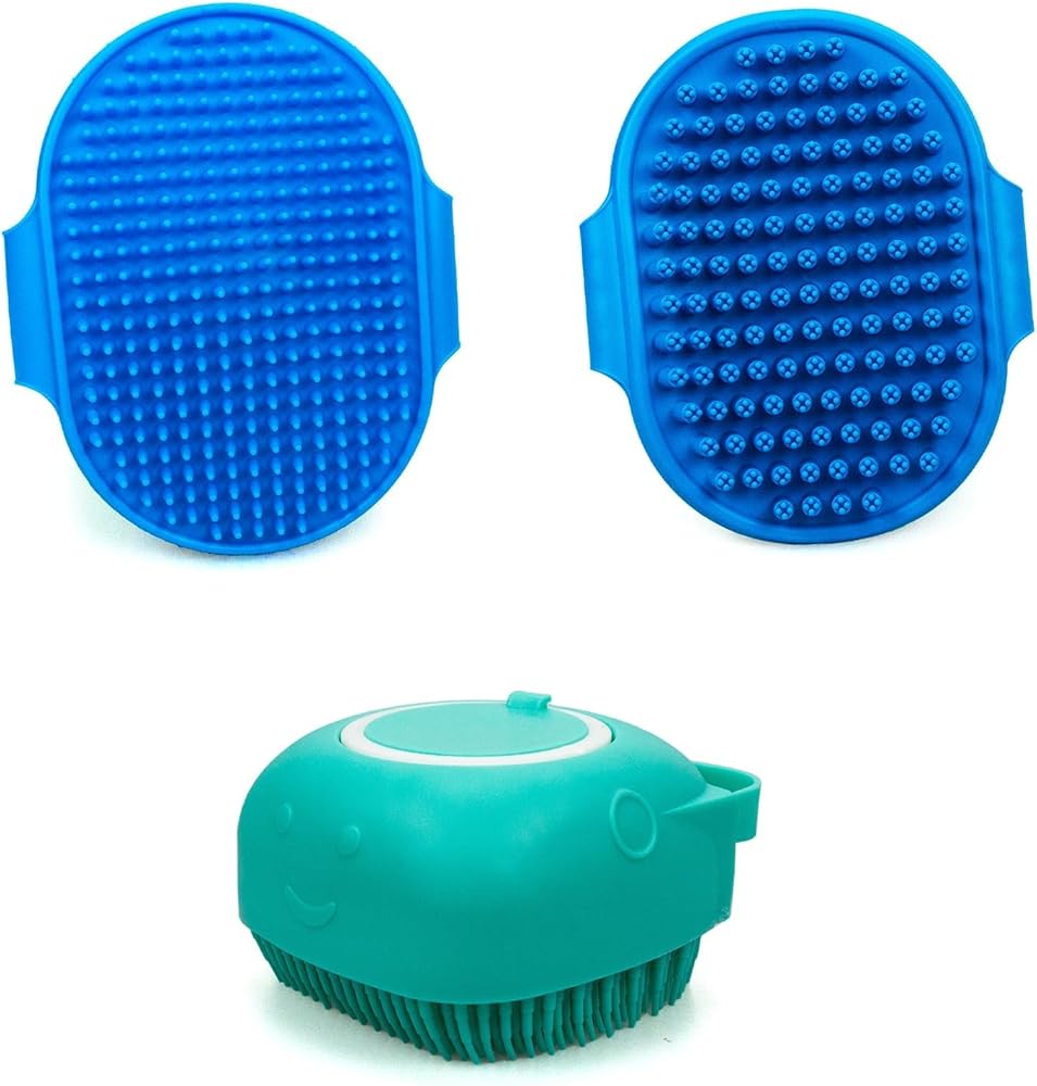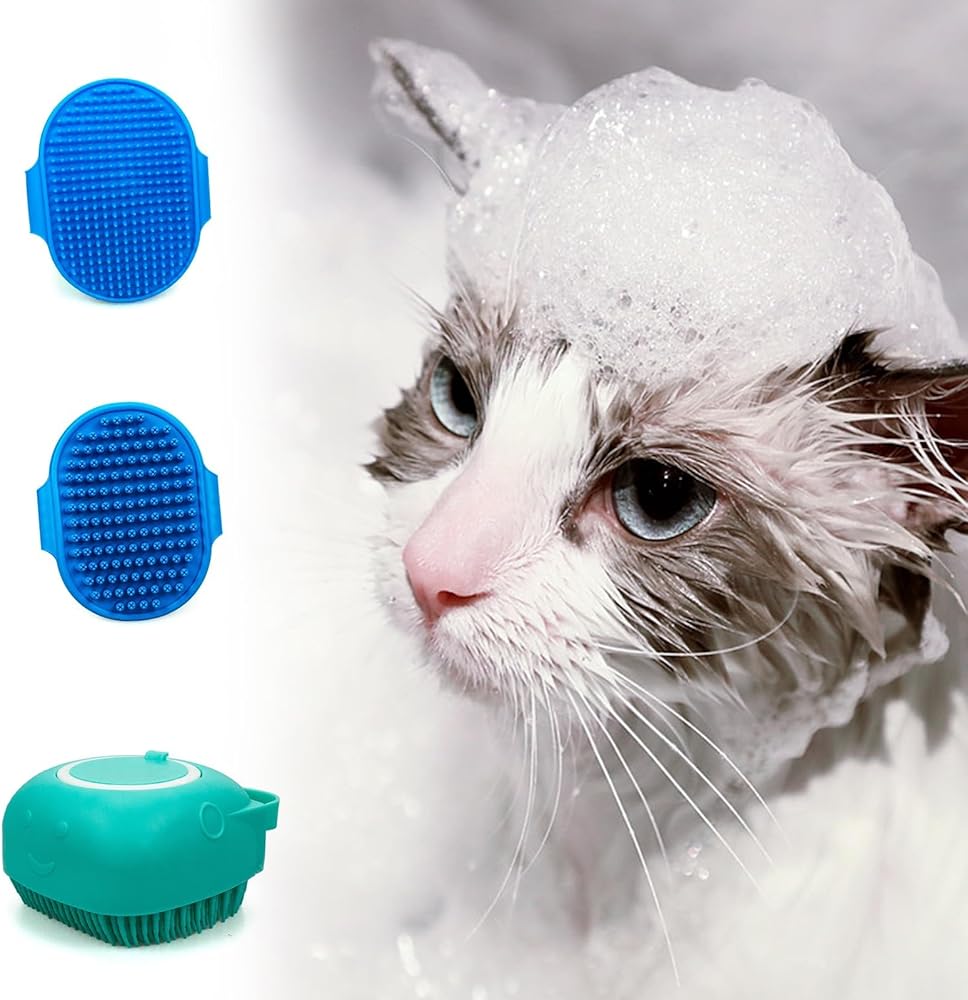 t seems you're describing a product that includes three pieces of a dog and cat bath brush scrubber, each with specific features. Here's a breakdown of the information you provided: Quantity: You have a set of three (3 Pcs) dog and cat bath brush scrubbers, which means you have multiple units for your pet grooming needs. Material: These scrubbers are made of silicone, a soft and flexible material that is often used for pet grooming tools due to its gentle touch on a pet's skin. Shampoo Dispenser: The brush scrubbers come equipped with a shampoo dispenser feature. This means you can add shampoo to the scrubber, making it easier to distribute and apply the shampoo to your pet's fur during bath time. This can save time and effort during the grooming process. Pet Massage: These brush scrubbers are designed not only for cleaning but also for providing a massage to your pets. The silicone bristles can help stimulate your pet's skin and provide a relaxing and enjoyable experience for your cat or dog during the bath. Adjustable Ring Handle: The scrubbers come with an adjustable ring handle. This feature allows you to securely hold and control the brush while grooming your pet. It ensures a comfortable grip and ease of use during the bath. Suitable for Haired Dogs and Cats: These brush scrubbers are specifically designed for pets with hair. They can be used for both dogs and cats, making them versatile grooming tools for different pet owners. In summary, these three dog and cat bath brush scrubbers are versatile grooming tools that include a shampoo dispenser, a pet massage feature, and an adjustable ring handle. They are designed to make the bathing and grooming process more convenient and enjoyable for both pets and their owners.