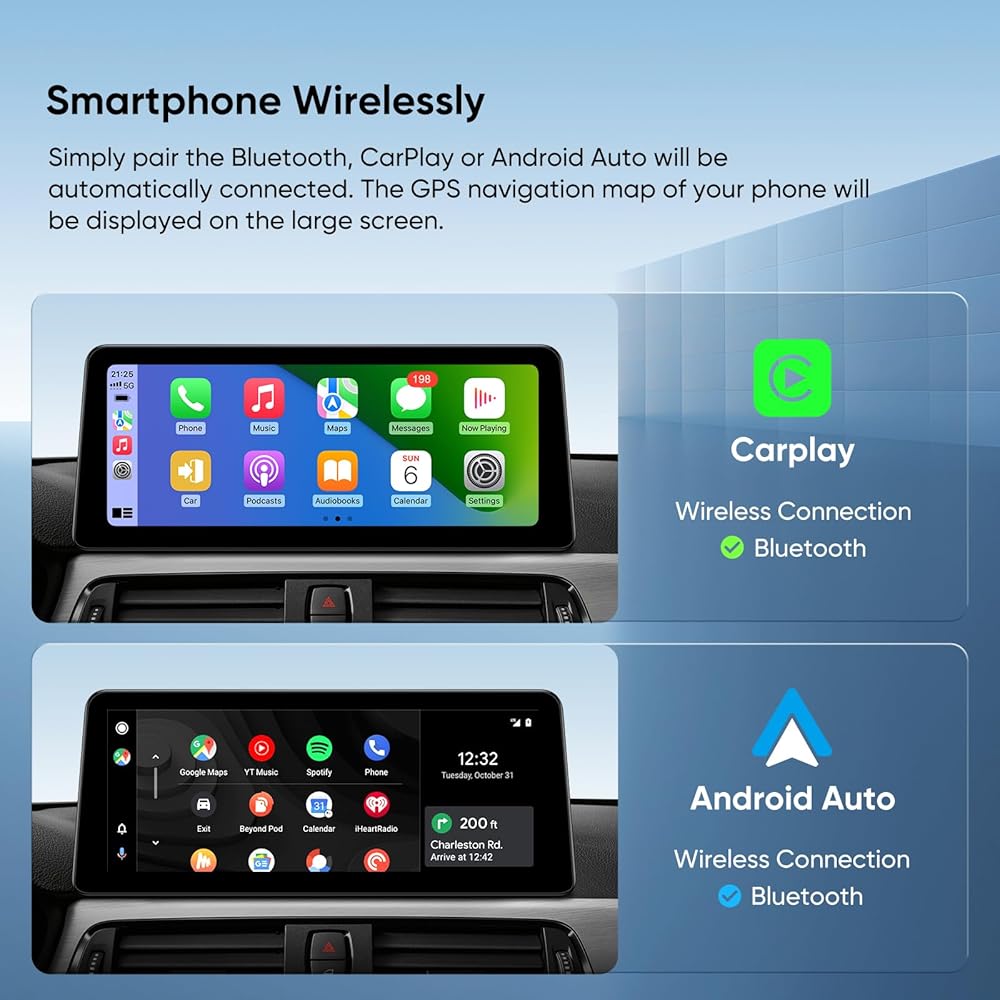 【تكامل مثالي】مصمم خصيصًا لسيارات BMW. لا تتطابق هذه الوحدات مع لوحة القيادة الأصلية للحصول على مظهر متكامل تمامًا فحسب، بل توفر أقوى تجربة لاسلكية CarPlay /Android Auto وشاشة تعمل باللمس لسيارتك BMW، مما يجعل لوحة القيادة أكثر ذكاءً من أي وقت مضى.