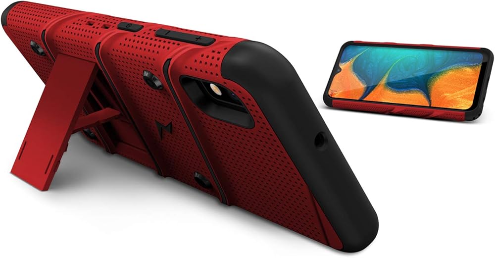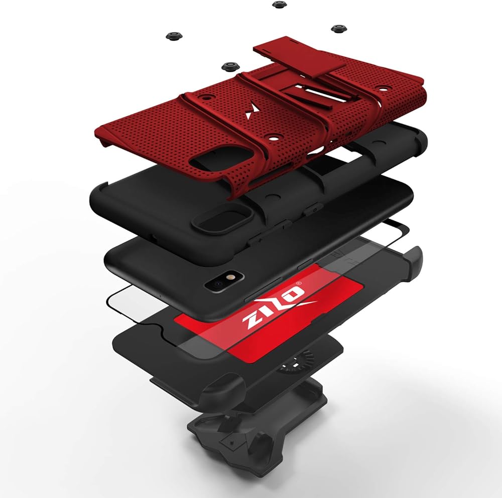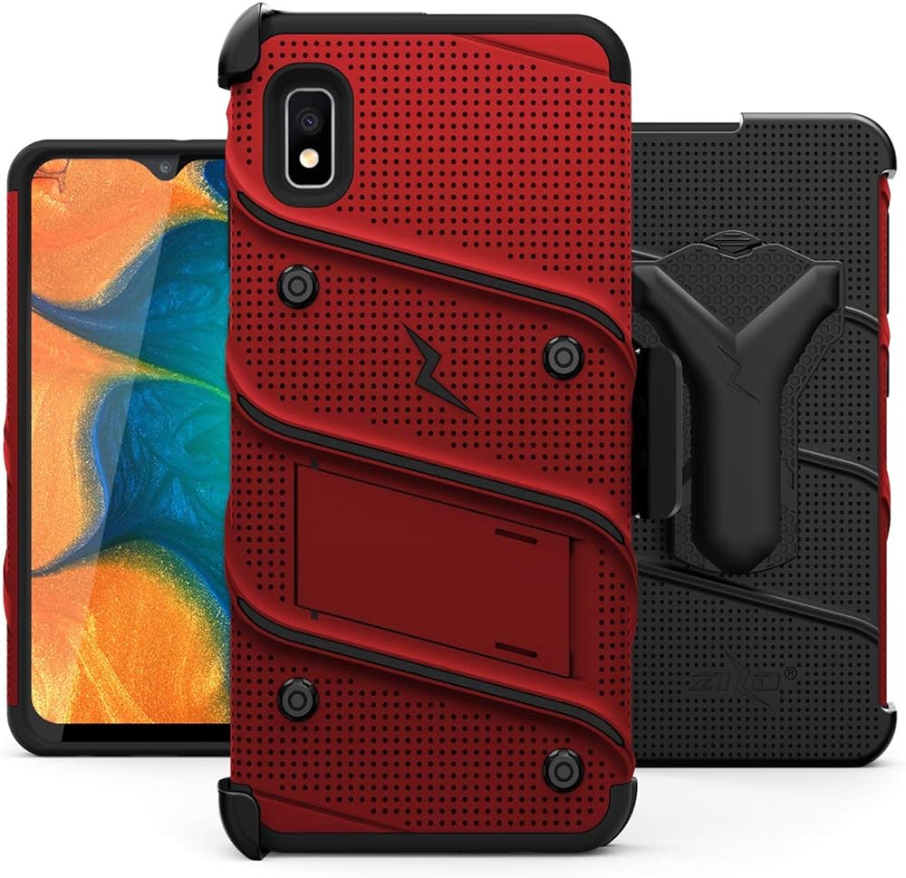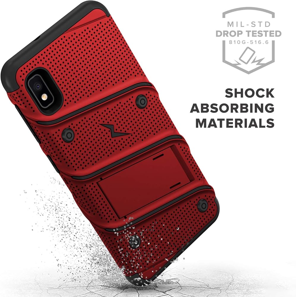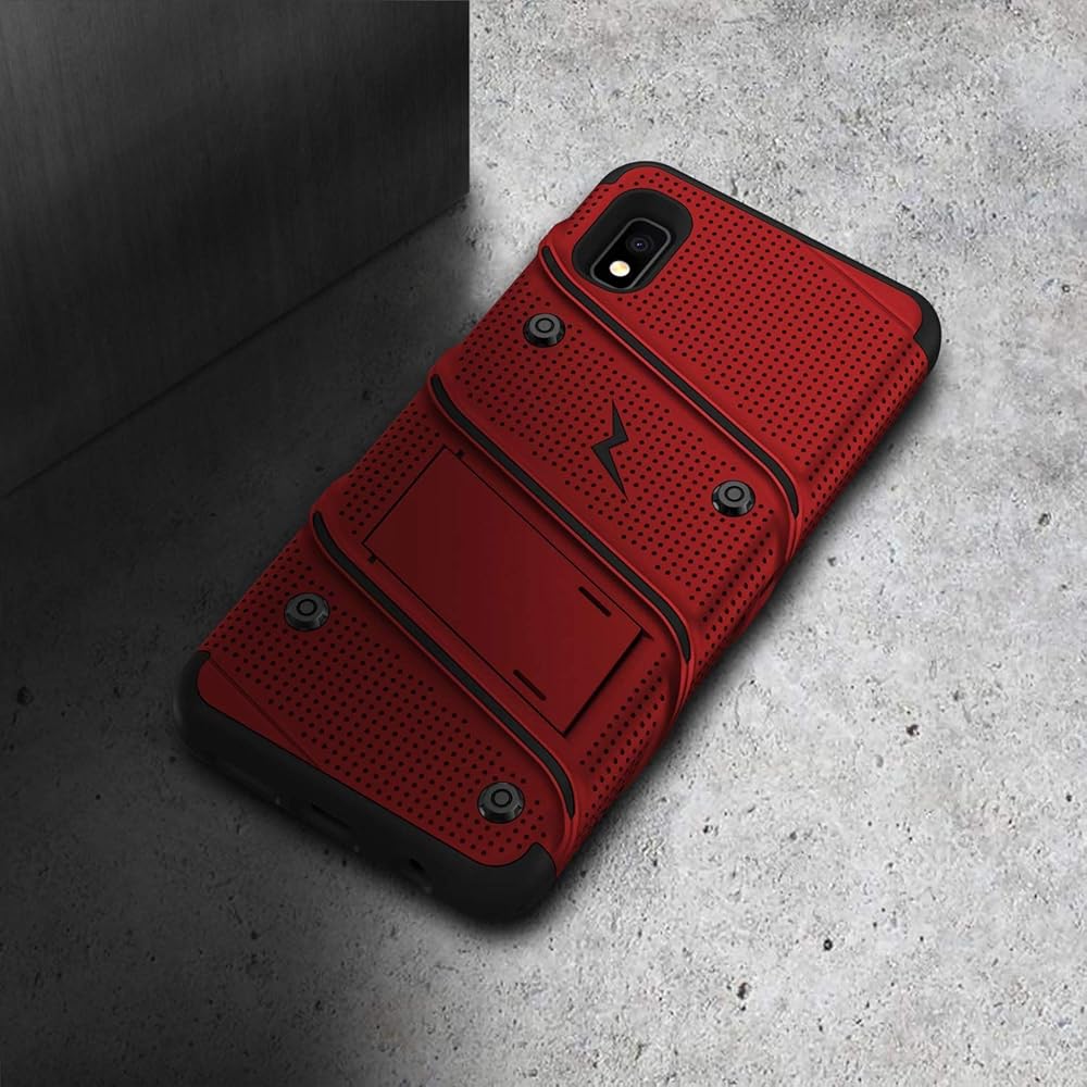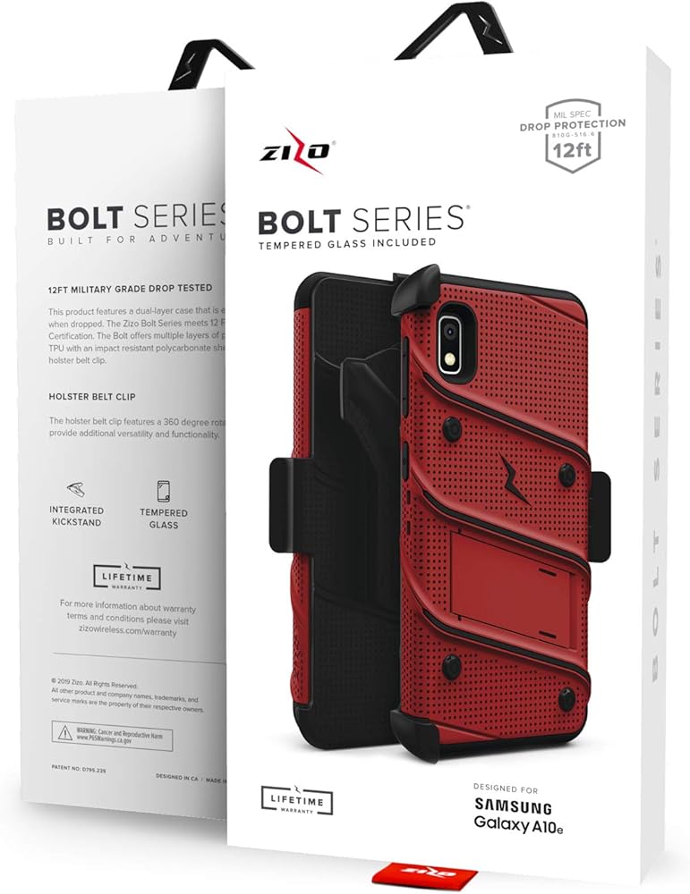 سلسلة ZIZO Bolt لحافظة سامسونج جالاكسي A10e | حماية شديدة التحمل من السقوط من الدرجة العسكرية مع مسند مزود بمشبك حزام وحزام من الزجاج المقسى (أحمر/أسود)