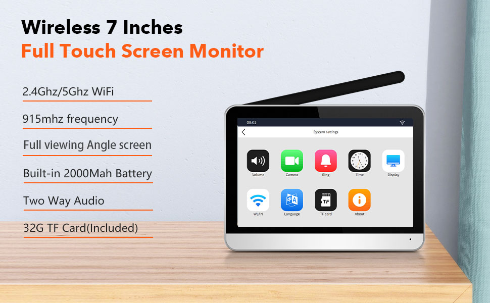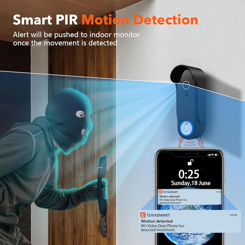 لا توجد رسوم شهرية وتسجيل فيديو تلقائي: سيتم دفع التنبيه إلى هاتفك الخلوي والشاشة الداخلية بمجرد اكتشاف الحركة (في نطاق 5 أمتار). سيتم التقاط الفيديو وحفظه تلقائيًا على بطاقة TF الخاصة بالشاشة الداخلية (المضمنة 32 جيجا)، والتي يمكنك تشغيلها على الشاشة الداخلية أو هاتفك، بدون اشتراك أو رسوم شهرية.