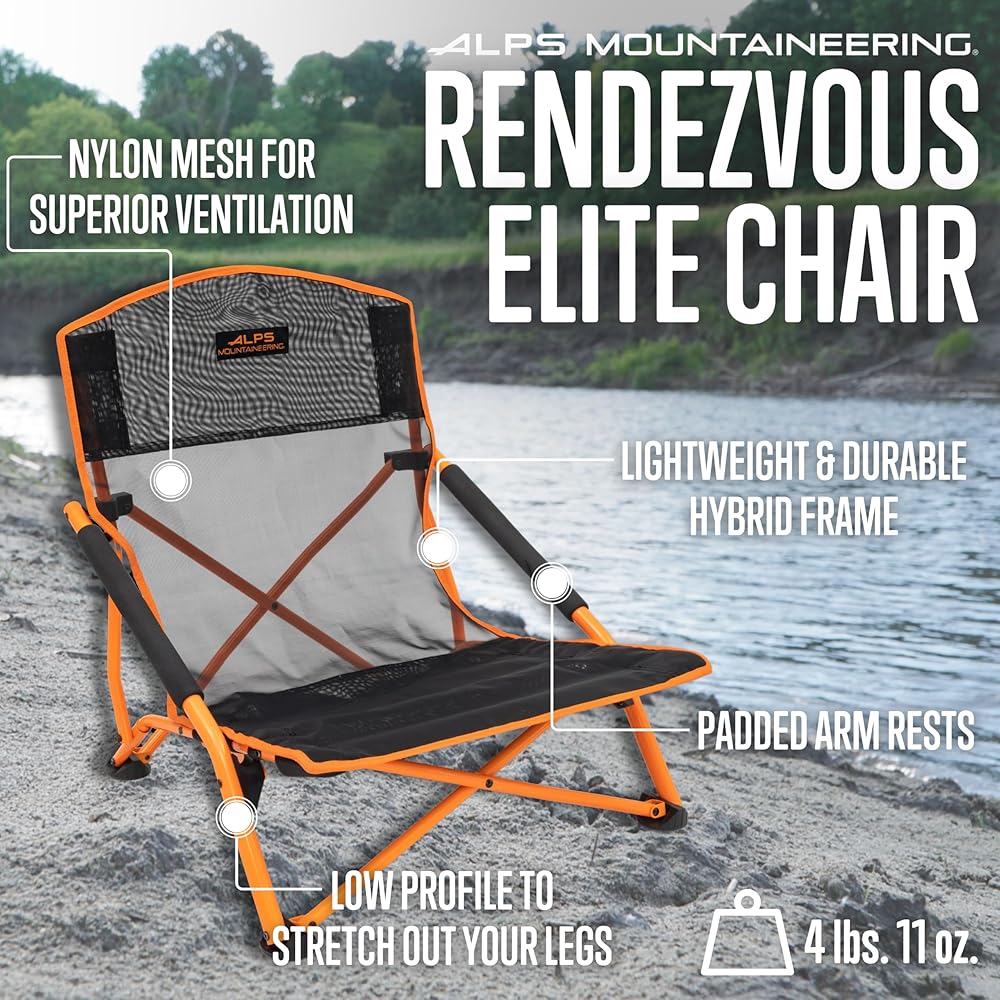 A warm weather spin-off of the classic ALPS Mountaineering Rendezvous camp chair, the Rendezvous Elite brings summertime seating to the next level. Whether you're basking in the sun at the beach, listening to your favorite band at an outdoor concert, or sitting around the pool chatting with friends, the Rendezvous Elite camping chair provides the same low-profile seating with the addition of superior ventilation. Constructed using a lightweight yet durable powder-coated aluminum/steel hybrid frame with 100% nylon mesh seat, the Rendezvous Elite weighs in at under 5 lbs., making it effortless to tote to any event. The chair sits low to the ground and allows you to lean back at a perfect angle to relax and stretch out your legs. The chair collapses and fits into the included carry bag, so transporting and storing the chair is convenient and easy.