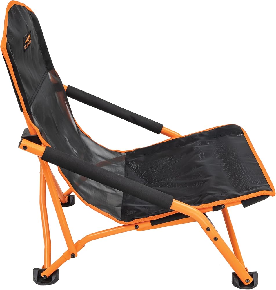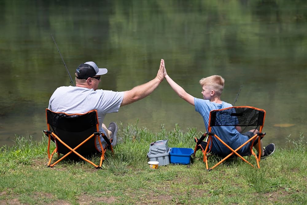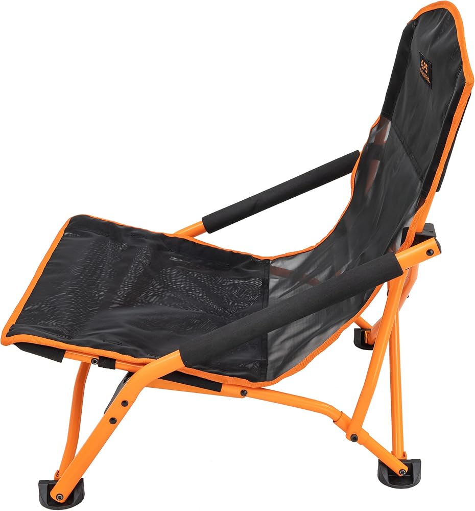 LOW camping chair for adults, with comfortable padded arms sits close to the ground and lets you lean back and stretch your legs – a perfect fishing chair or hunting chair