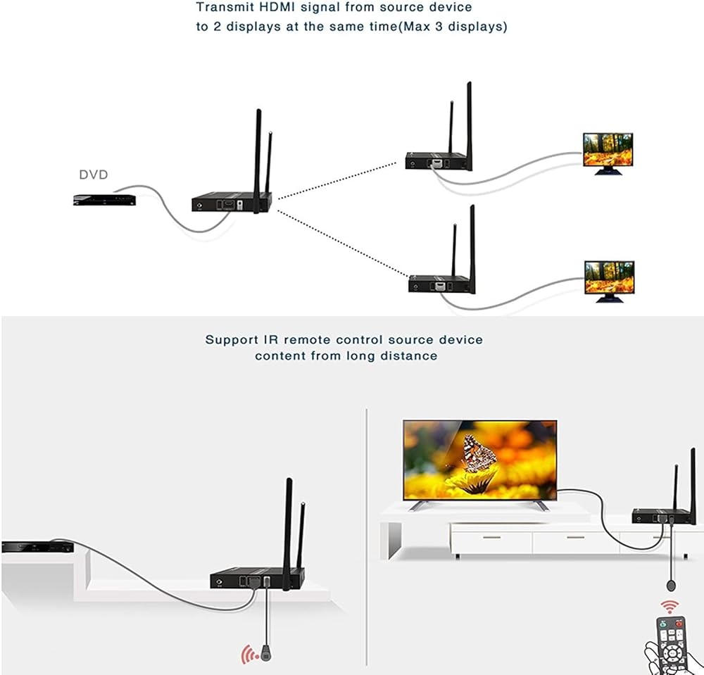 مَا 𝐔𝐒𝐋𝐘 - يمكن لجهاز الإرسال إرسال الفيديو إلى جهازي استقبال، وهو أمر مفيد للبث عبر شاشتي عرض HDMI. مع تنفيذ تصميم الهوائي المزدوج، تم تحسين معدل البيانات بشكل كبير، مما يؤدي إلى نقل فيديو أكثر استقرارًا وطلاقة.