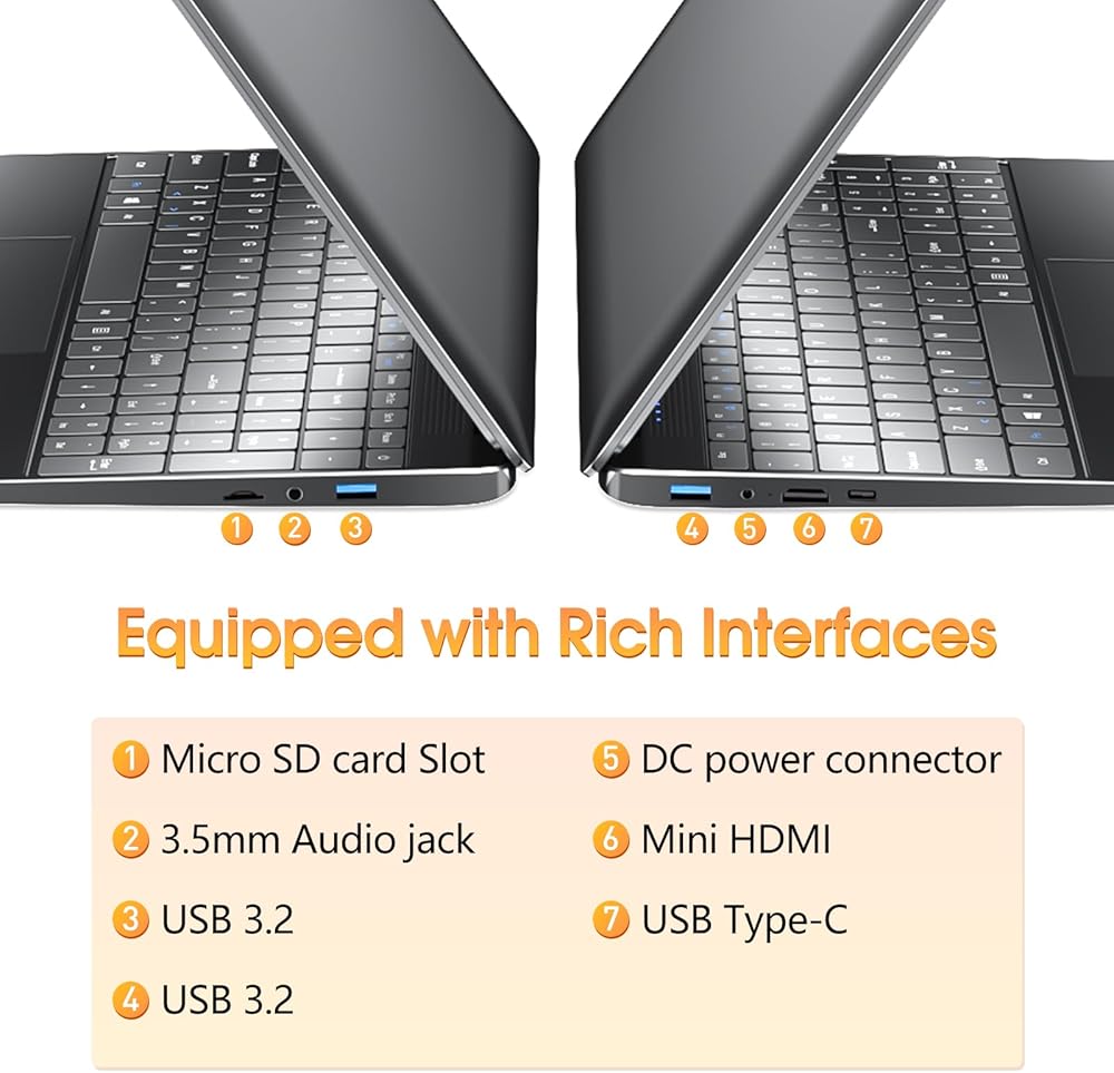 واجهة متعددة الوظائف: اتصال سريع مع Bluetooth 4.2 وواي فاي سريع عبر شبكة WiFi مزدوجة النطاق، مجهزة بنوع C، Mini HDMI x1، مقبس سماعة الرأس 3.5 مم x1، USB 3.0 x2، فتحة microSD x1. تلبي المنافذ العديدة متعددة الوظائف الموجودة بالكمبيوتر المحمول متطلبات الحياة والعمل.