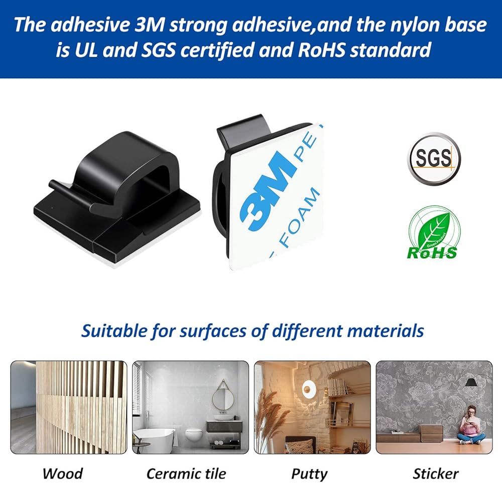 Adhesive Cable Clips: Our cable holder clips are made from 3M Strong Adhesive and PA66 nylon.super sticky back pad, and easily peel-off backing, which makes our adhesive wire clips sturdy and durable.