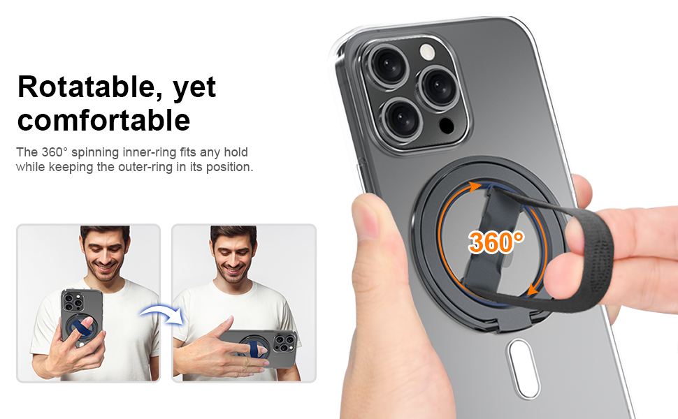 قبضة هاتف مرنة ومريحة: يتميز هذا الحزام بحزام أكثر راحة وقابلية للتمدد ومرونة عالية. بفضل طوله الممتد، فإنه يقلل بشكل كبير من الضغط على الأصابع عند استخدام الحزام. تم تثبيت الحزام على حلقة داخلية قابلة للدوران، مما يسمح لك بضبط هاتفك بسهولة على الزاوية الأكثر راحة أثناء استخدام المقبض.