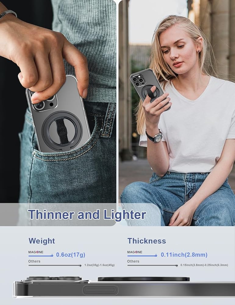 أرفع وأخف وزنًا: يزن فقط 0.6 أونصة (17 جرامًا) ويبلغ سُمكه 0.11 بوصة (2.8 ملم)، وقد تم تصميم مقبض الهاتف هذا ليكون خفيف الوزن وصغير الحجم، مما يوفر شعورًا ممتازًا أثناء الاستخدام. تتميز الحلقة الخارجية بآلية قفل تلقائي عند طيها، مما يسمح بسهولة تخزينها في الجيب.
