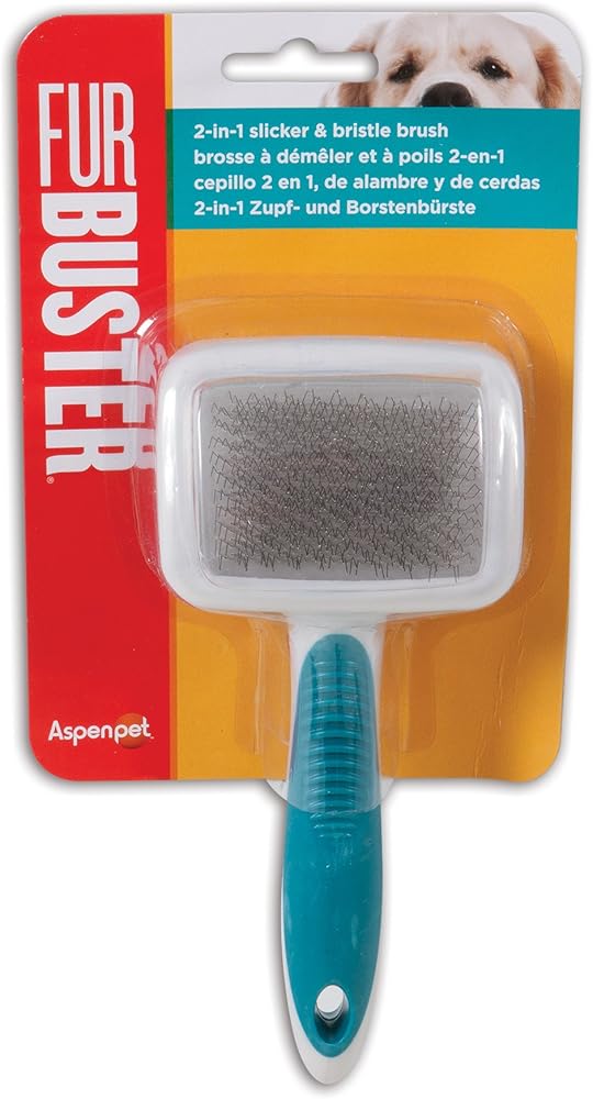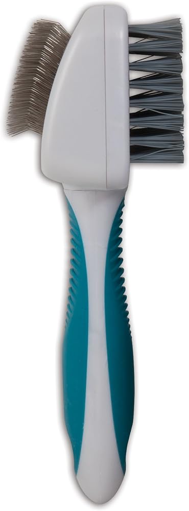 This essential grooming tool will keep your dogs coat looking soft and beautiful. One side features a wire slicker brush which will help remove tangles, dead hair and debris while distributing healthy coat oils that your dog needs. The other side has a soft nylon bristles that smooth the coat for a healthy, shiny appearance. Cushioned, non-slip handle with a comfortable grip. Great for Small Dogs.