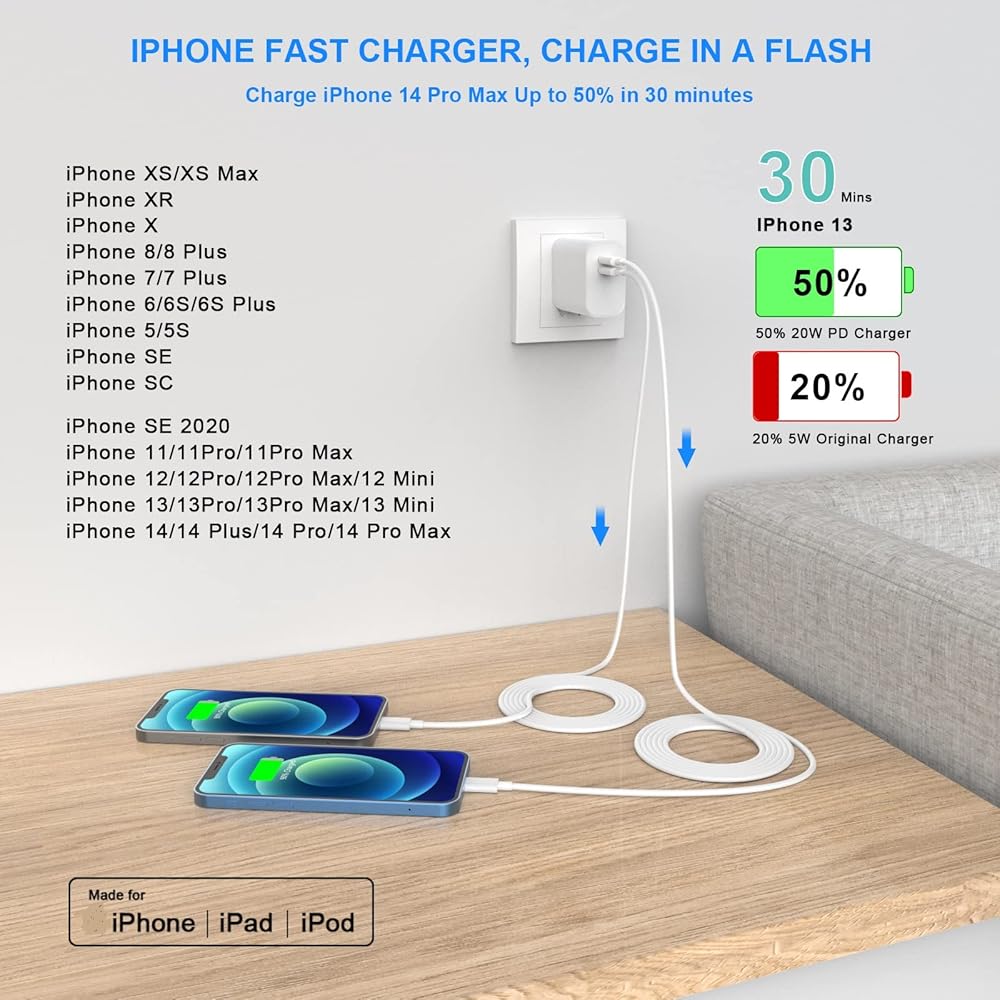 10FT Long iPhone fast charger with Original USB C to Lightning cord, charges iPhone 13 Pro Max up to 50% in just 30 minutes, which saves more than 1.5 hours when compared to the 5W charger.